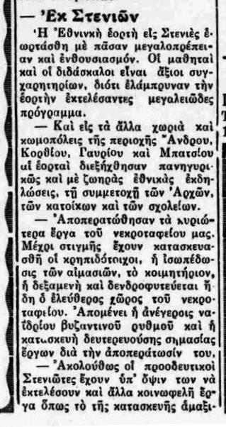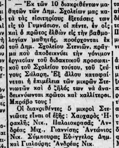 Δεξιά, απόκομμα από τον «Ανδριώτη» της 13ης Αυγούστου 1948, που αναφέρεται στη επιτυχία Στενιωτών μαθητών στις εισιτήριους εξετάσεις για το Γυμνάσιο.