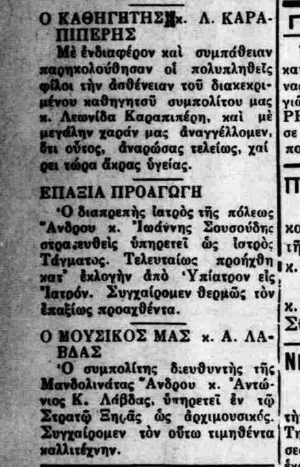 Δεξιά, απόκομμα από τον «Ανδριώτη» της 14ης Ιανουαρίου 1949, που αναφέρεται στον Λεωνίδα Ν.Καραπιπέρη.