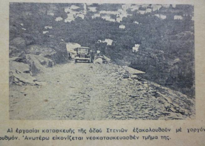 Κάτω, εργασίες για τη διάνοιξη της αμαξιτής οδού Χώρας - Στενιών. Εποχή γύρω στο 1950-51. |