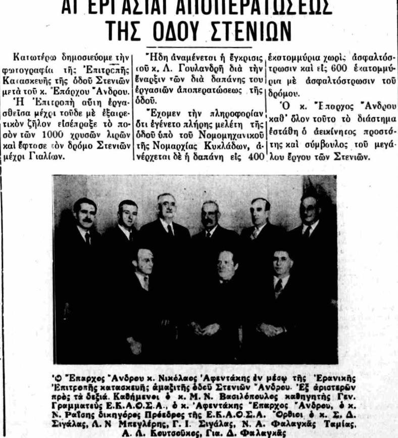 Από δημοσίευμα της εφημερίδα ΑΝΔΡΙΩΤΗΣ της Παρασκευής 23/5/1952. Στη κάτω σειρά και στο μέσο ο τότε Έπαρχος της Άνδρου. Τα πρόσωπα της φωτογραφίας αναφέρονται και εδώ. |