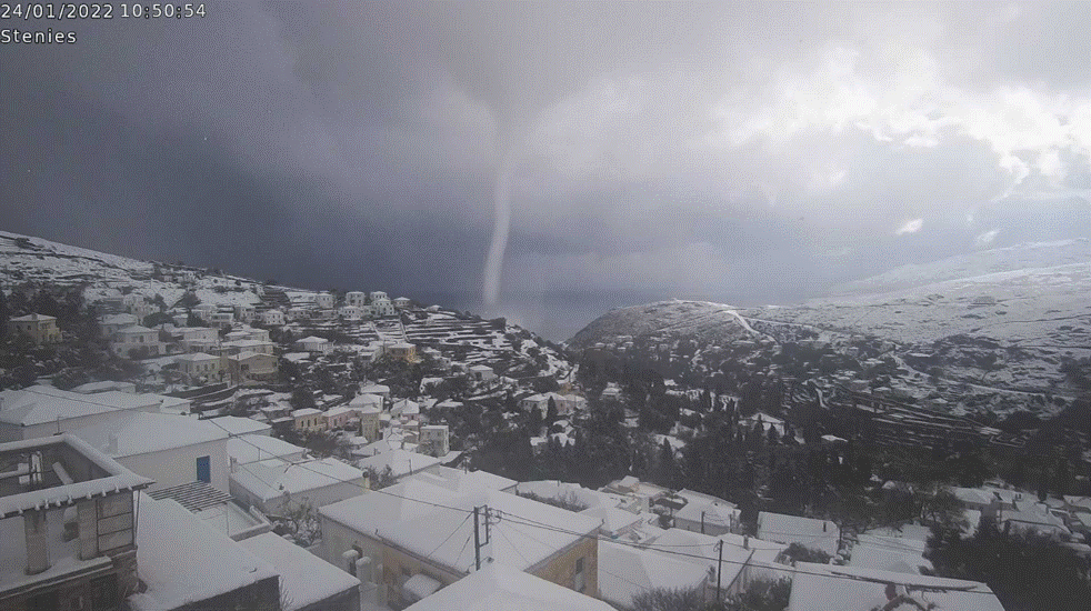 Η παρακάτω φωτογραφία είναι από την κάμερα του κου Γιάννη Μπουκουβάλα. Συνέβη κατά τη διάρκεια της καταιγίδας «Ελπίδα», στις 24 Ιανουαρίου 2022, στην παραλία Γιάλια των Στενιών.
