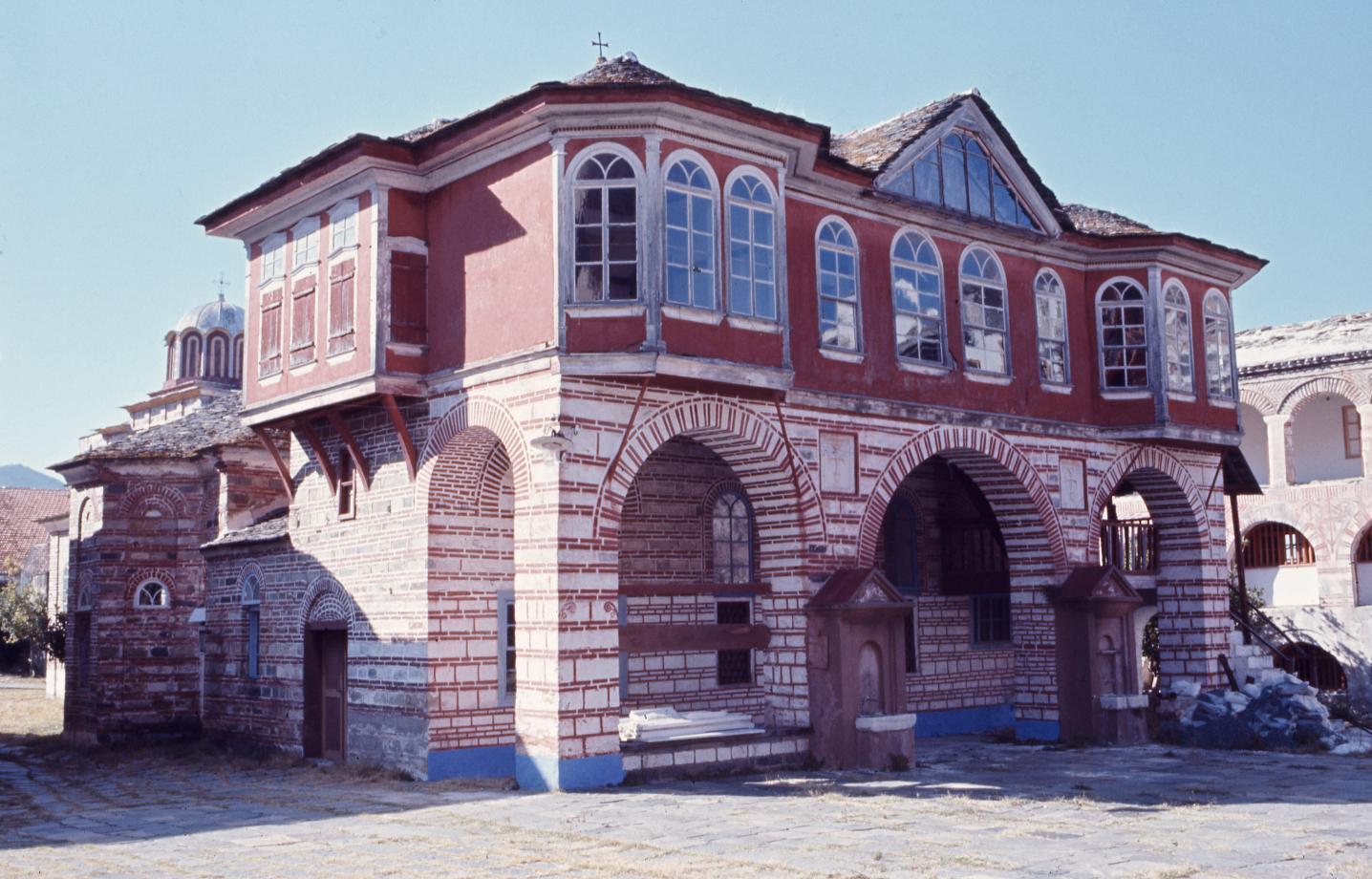 Η Τράπεζα του Βατοπεδίου. Εμπρός από το κτήριο υπάρχουν δύο Κρήνες.