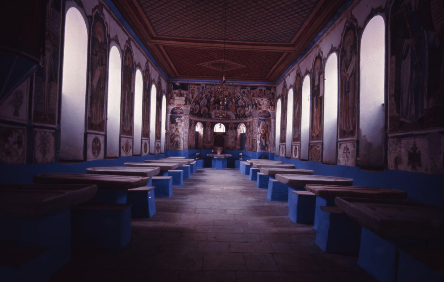 The inside of the Trapeza. The tables are made of marble. The seats are on purpose as uncomfortable as possible.