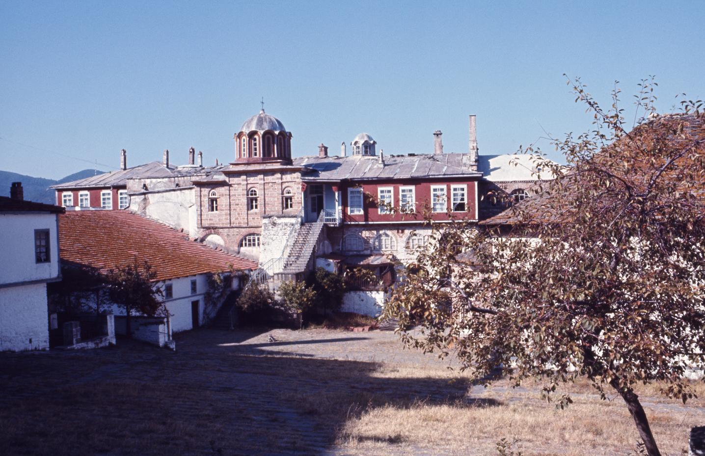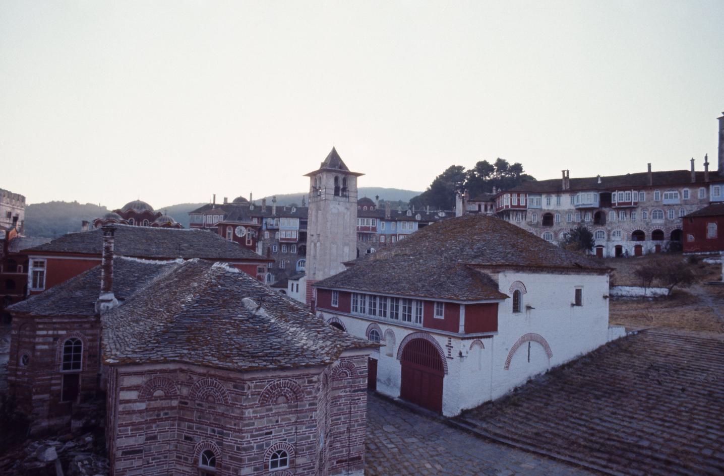 The view from the Archontariki. To the left, the Trapeza (the refectory) and in the middle the bell tower. The use of the building to the right was a gallery for the holy icons of the monastery.