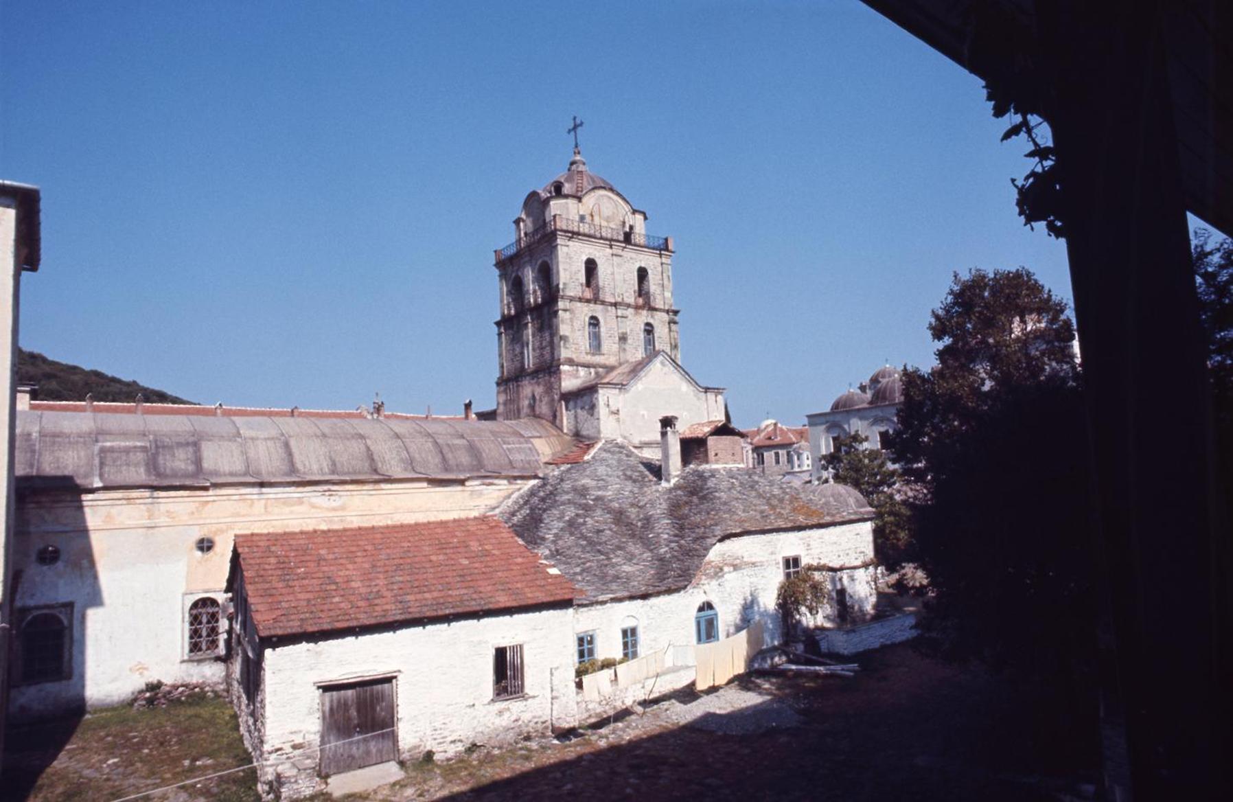 Η θέα από το Αρχονταρίκι. Σε πρώτο πλάνο, τα μαγειρεία του μοναστηριού και πίσω τους η Τράπεζα. Στα δεξιά μόλις διακρίνεται μέρος του Καθολικού.