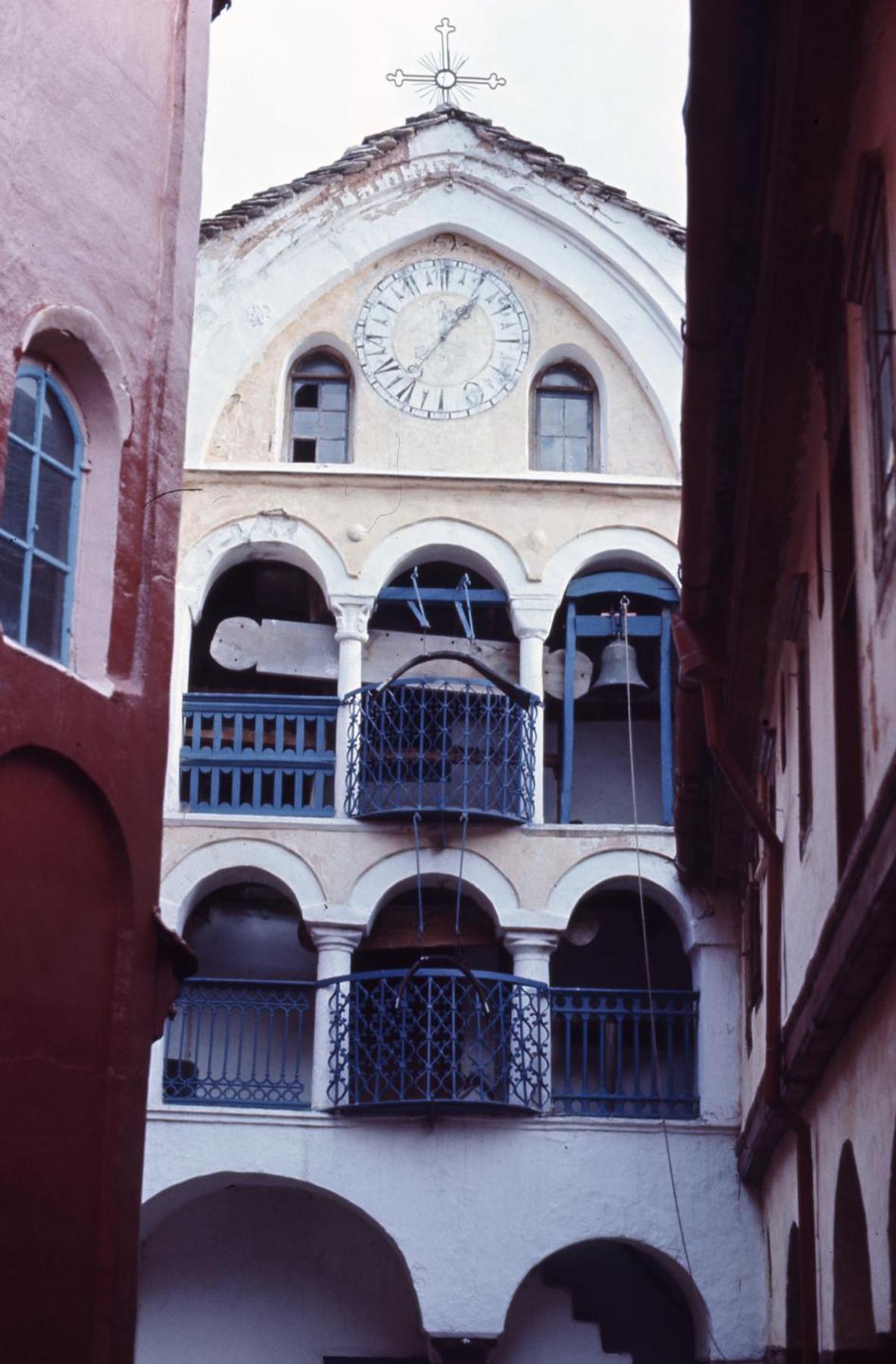 Καμπαναριό με ρολόι. Διακρίνονται τέσσερα σήμαντρα (δύο ξύλινα και δύο μεταλλικά) και μία καμπάνα.