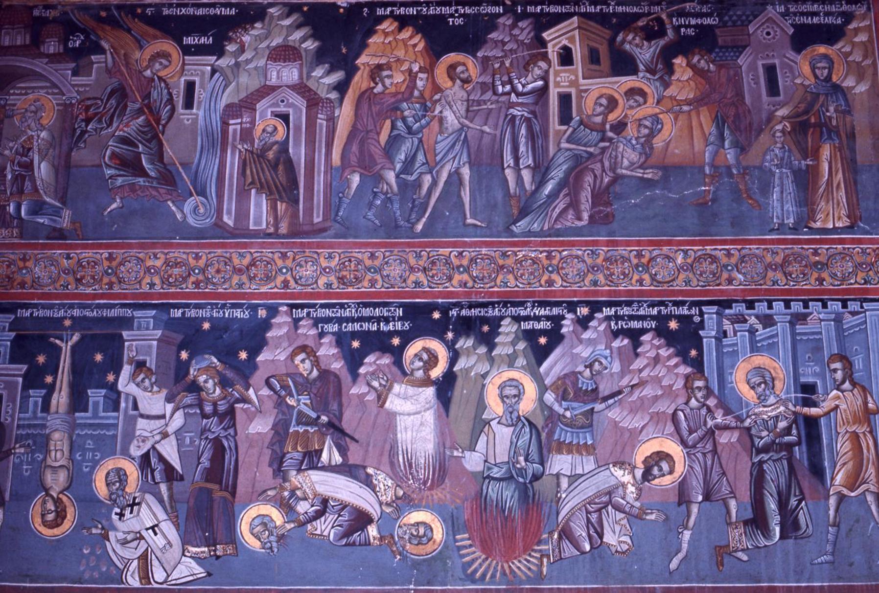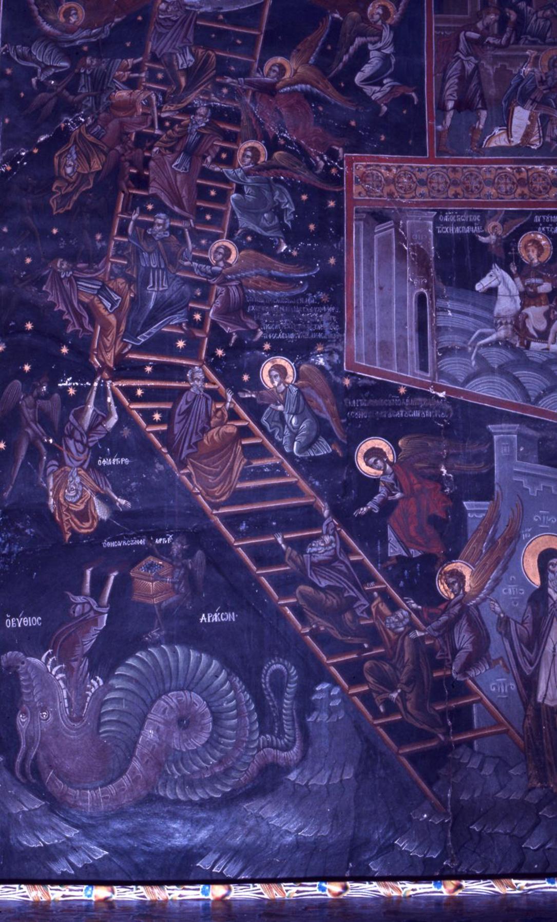 Ο τοίχος απέναντι από τις κολώνες της στοάς καλύπτεται με εικόνες από το βιβλίο της Αποκάλυψης
