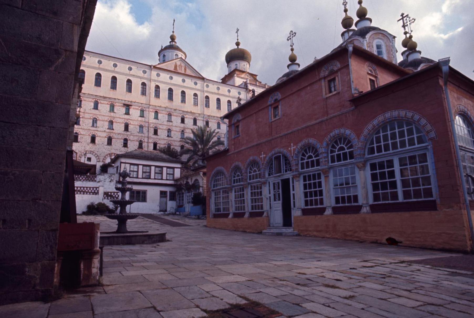 View of the inner yard and the Katholikon in the centre. To the right the Bell tower.