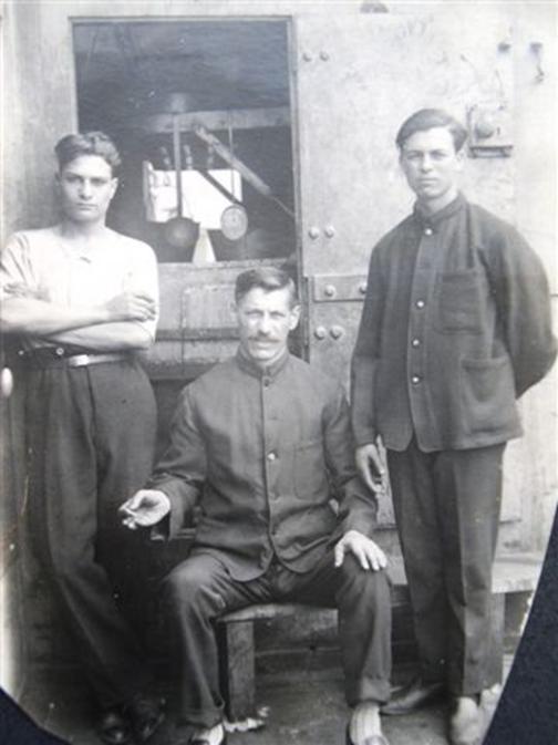Αριστερά, όρθιος με λευκό πουκάμισο ο Αντώνης στα τέλη της δεκαετίας του ‘20 μπαρκαρισμένος μηχανικός |