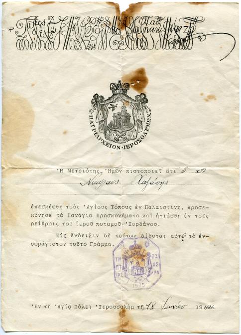 Δεξιά, πιστοποιητικό από τα Ιεροσόλυμα ότι ο Νικολός Χαζάπης ήταν Χατζής |