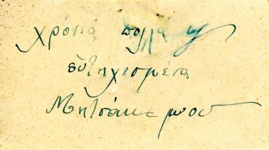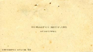 Ο Θόδωρος ήταν ξυλουργός το επάγγελμα. Επάνω, το επισκεπτήριο του. Οι ευχές απευθύνονται στον πρώτο εξάδελφο της Ελισώς, τον Μήτσο Πασχάλη.