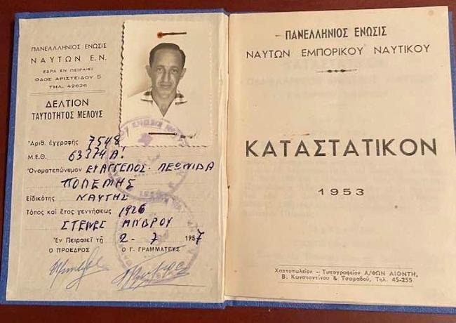 Πάνω, το βιβλιάριο - Καταστατικό μέλους Ναυτών Εμπορικού Ναυτικού.