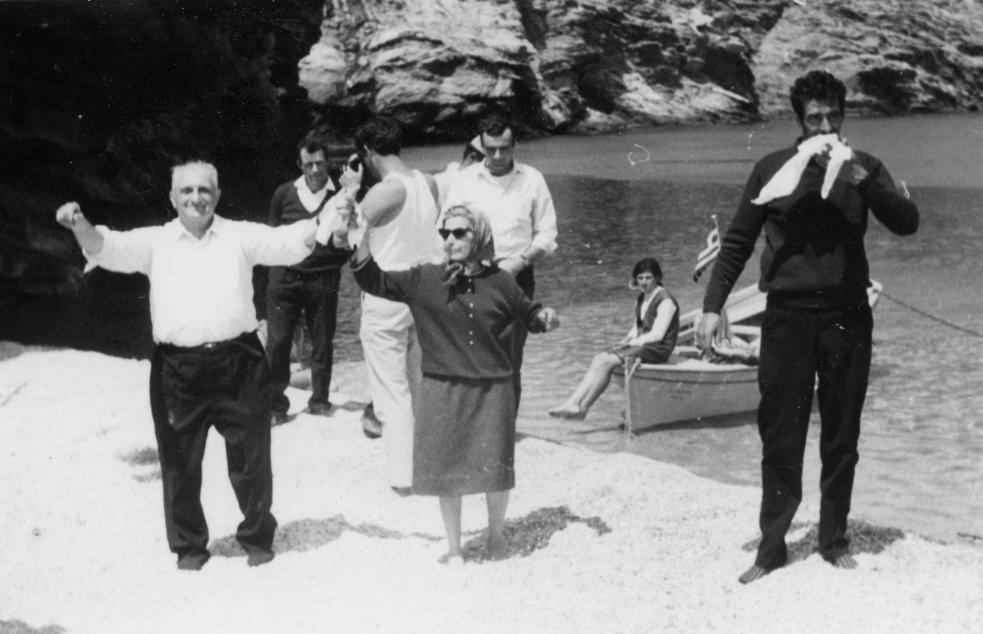 Ηταν η 9η Μαΐου 1971 και πολλοί Στενιώτες είχαν επισκεφτεί το εξωκλήσι του Αγίου Νικολάου στην παραλία του Αχλα. Κατά το έθιμο, μετά τη λειτουργία έστηναν γλέντι. Εδώ φαίνεται η Θοδώρα να χορεύει με τον καπτα Γιαννούλη Φαλαγκά (Σουστούρη) (14321) #1975 info.