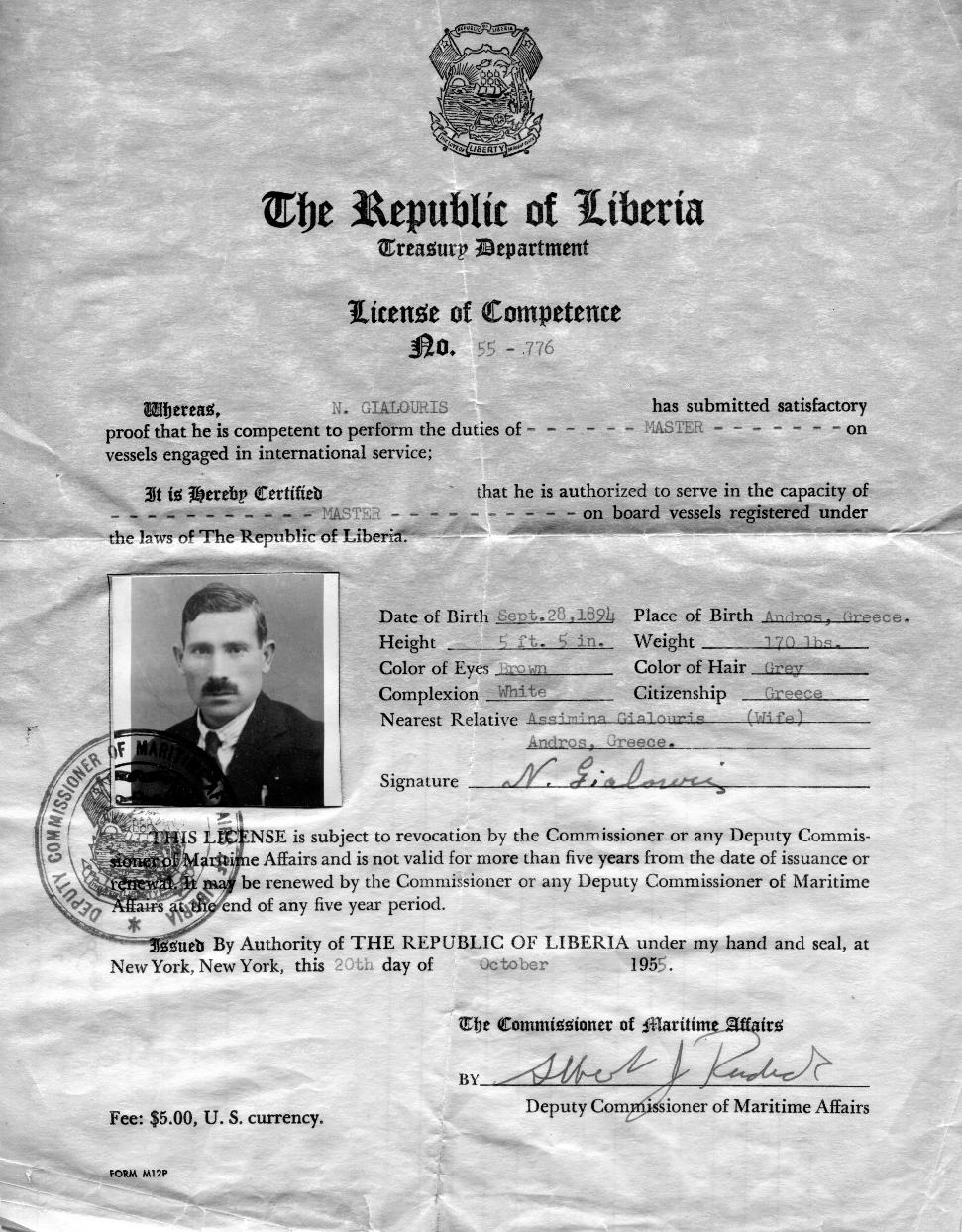 Πάνω, μία (πενταετής) Λιβεριανή άδεια εξασκήσεως του επαγγέλματος του πλοιάρχου, απαραίτητη σε όσους υπηρετούσαν σε πλοία με σημαία (ευκαιρίας) Λιβερίας. |