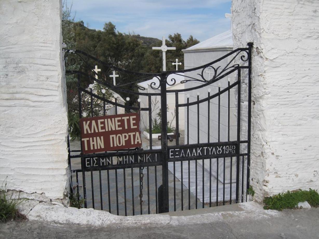 Η επιγραφή «ΕΙΣ ΜΝΗΜΗΝ ΝΙΚ.Ι.ΕΞΑΔΑΚΤΥΛΟΥ 1948» στην πόρτα της εισόδου του νεκροταφείου αναφέρεται στον Εξαδάκτυλο Νικόλαο του Ιωάννη (12) #803 info (1868 - 1948). |