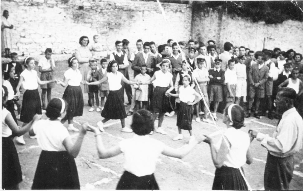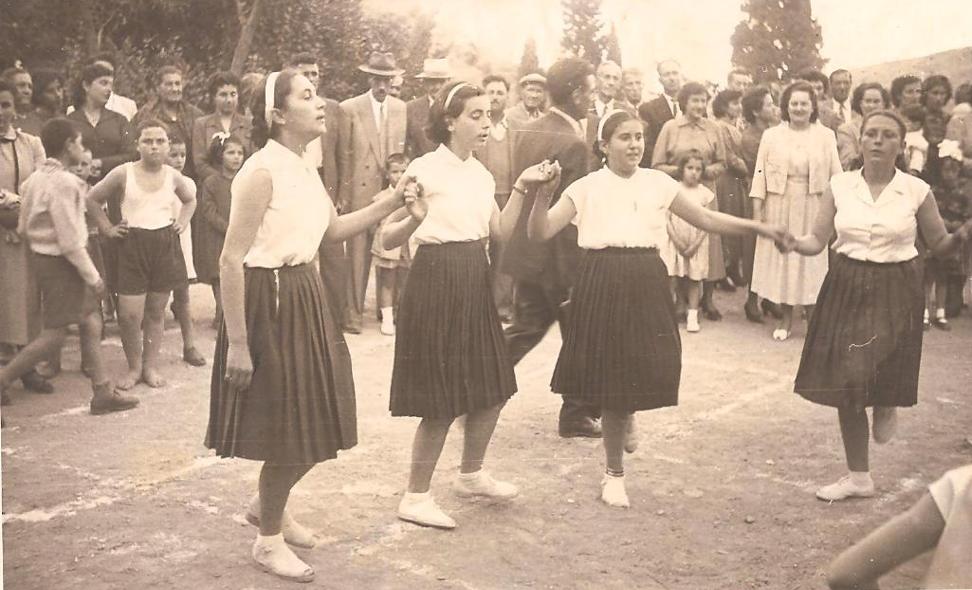 Διακρίνονται από αριστερά ο Κώστας Καλογήρου, πίσω του η μαμή Μαριώ η Μπάλσαινα, Με το ρεπουμπικο ο Αντώνογλου Γεώργιος του Νικολάου (112), Ο Κώστας Σαμιωτάκης και δίπλα του με τραγιάσκα ο Μπρισίμης (Γιώργης Ζαννή Πολέμης) και παραπέρα ο Δημήτρης Ρούσσος (Καπούτ). Τα κορίτσια από αριστερά ισως η Μαντούλα Ανδ. Σαρρη. η Τζουμέζη Μαρία του Θεοδόση ισως η Μπέη Μαρία του Δημητρίου και η Μανδαράκα Μαριώ του Νικολάου συζ. Καλογήρου Βαγγέλη του παπαΝικόλα. Πίσω αριστερά από τη Μαριώ, με άσπρο φόρεμα η Μαρία Μπουκουβάλα σύζ. Αντ. Χαζάπη