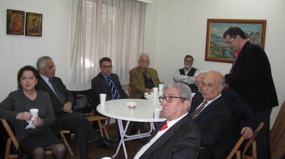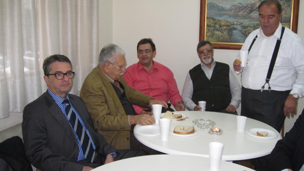 Κάτω, μέλη και φίλοι του Συνδέσμου απολαμβάνουν καφέδες, αναψυκτικά, κρασί , μεζέδες και κυρίως ο καθένας τη συντροφιά των άλλων. |