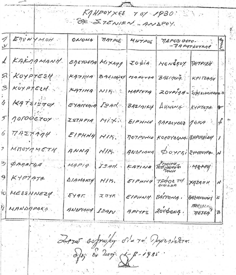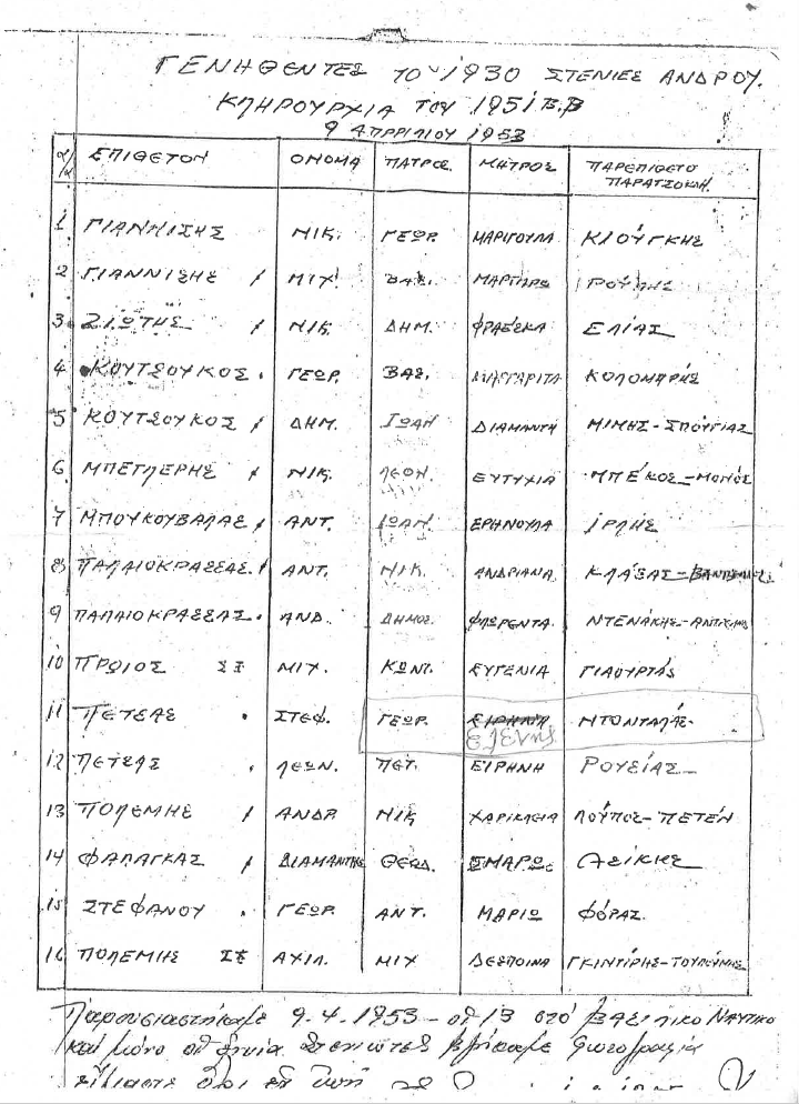 Το καλοκαίρι του 2019 λάβαμε από τον κο Πέτσα Στέφανο του Γεωργίου (1244) #2321 κατάλογο με τους συνομήλικους του, που γεννήθηκαν το 1930. Αναφέρονται 16 άνδρες και 11 γυναίκες. Ο κατάλογος γράφτηκε από τον Κουτσούκο Δημήτρη του Ιωάννη (11824) #285 στις 1 Αυγούστου 1985. Στο τέλος ο Δημήτρης ζητάει συγνώμη για την αναφορά του στα παρεπίθετα.