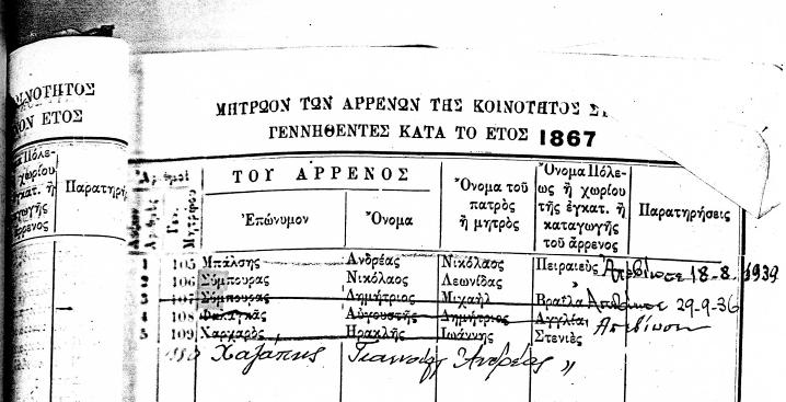 Μπάλσης Ανδρέας του Νικολάου (1122) #4939 (απεβίωσε 18/8/1939) Μπουκουβάλας ή Σύμπουρας Νικόλαος του Λεωνίδα (1331) Σύμπουρας Δημήτριος του Μιχαήλ (121) Φαλαγκάς Αυγουστής του Δημητρίου (15) Χαρχαρός Ηρακλής του Ιωάννη (1135) #1953 Χαζάπης Γιαννούλης του Ανδρέα (?) (άτομο με τα ίδια στοιχεία και στο έτος 1868) |