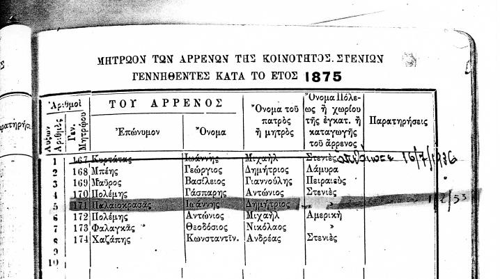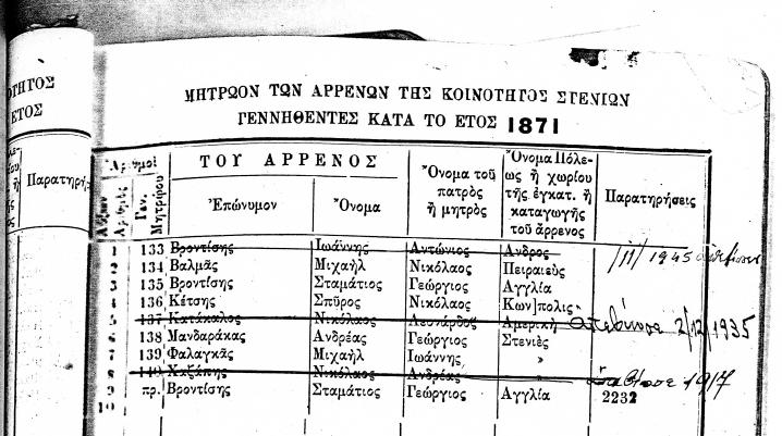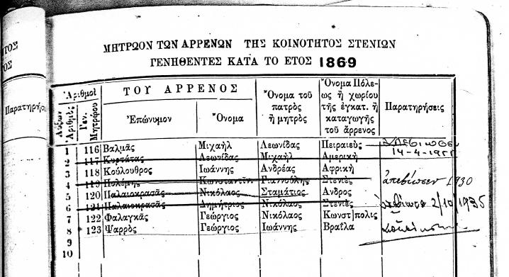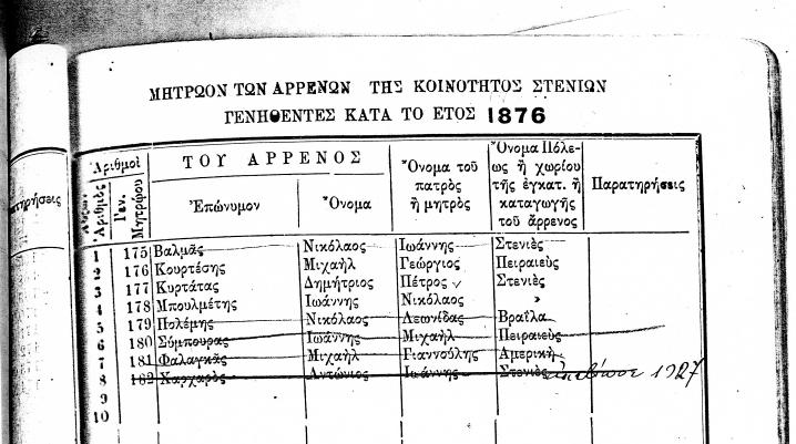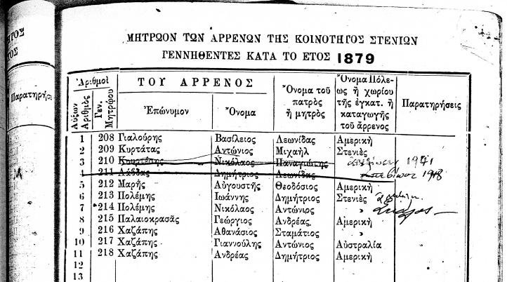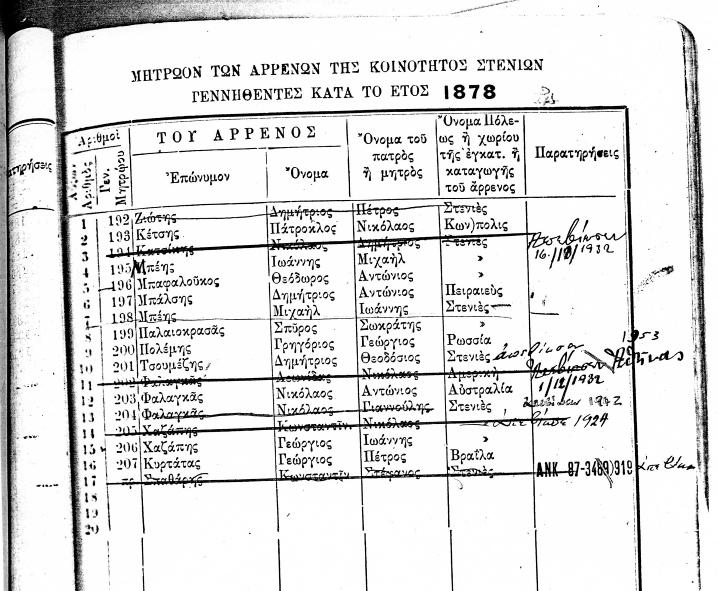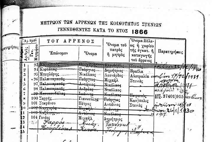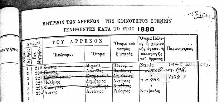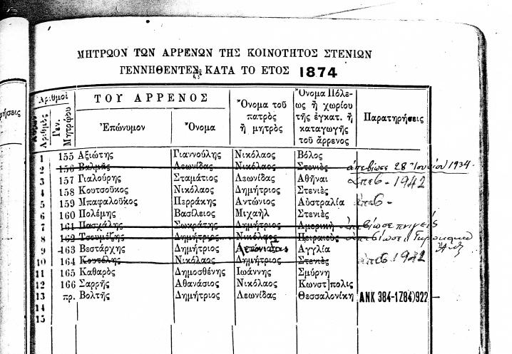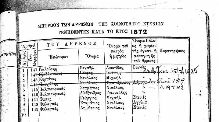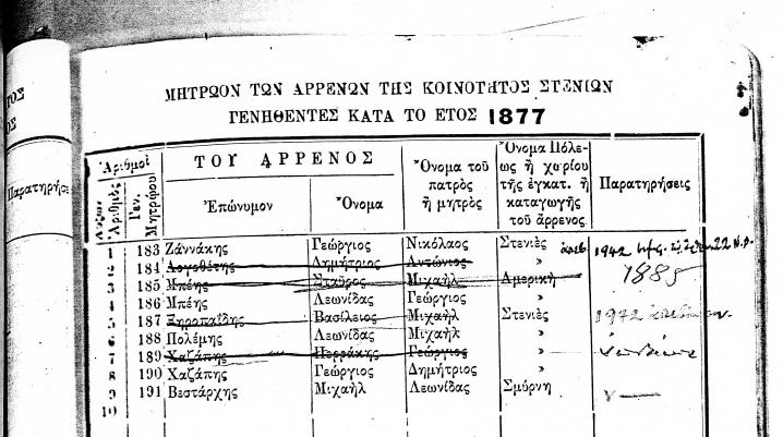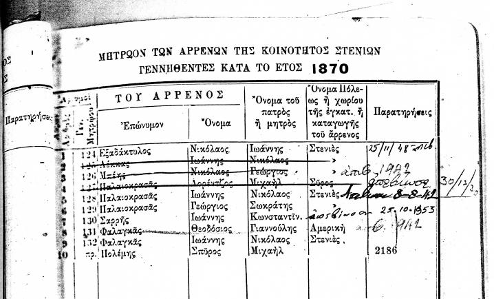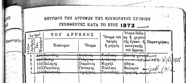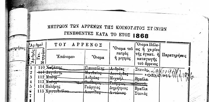 ΜΗΤΡΩΟΝ ΤΩΝ ΑΡΡΕΝΩΝ ΤΗΣ ΚΟΙΝΟΤΗΤΟΣ ΣΤΕΝΙΩΝ ΓΕΝΝΗΘΕΝΤΕΣ ΚΑΤΑ ΤΑ ΕΤΗ 1847 ΕΩΣ 1919
