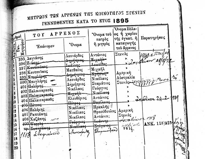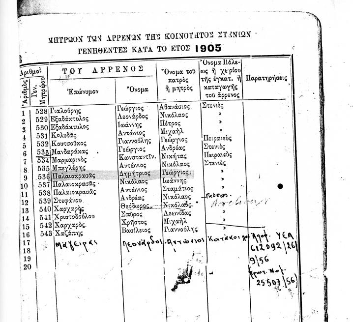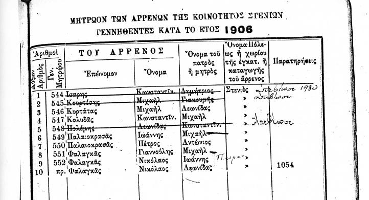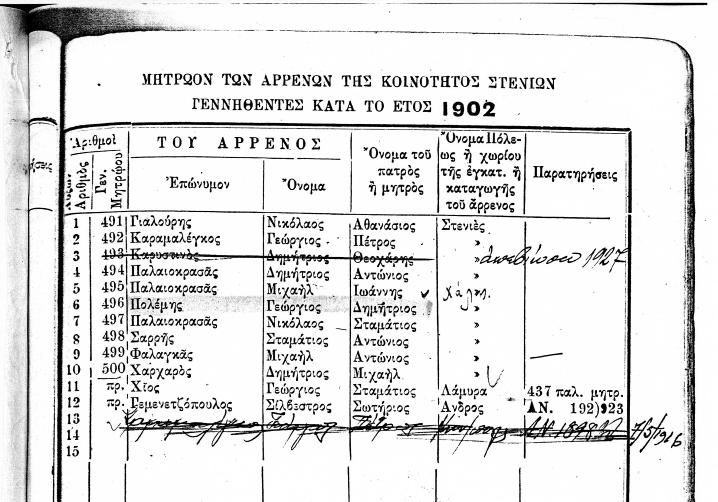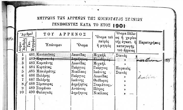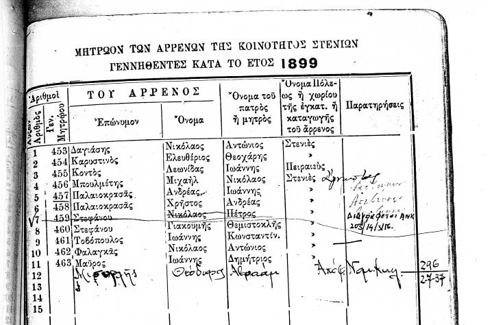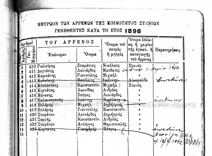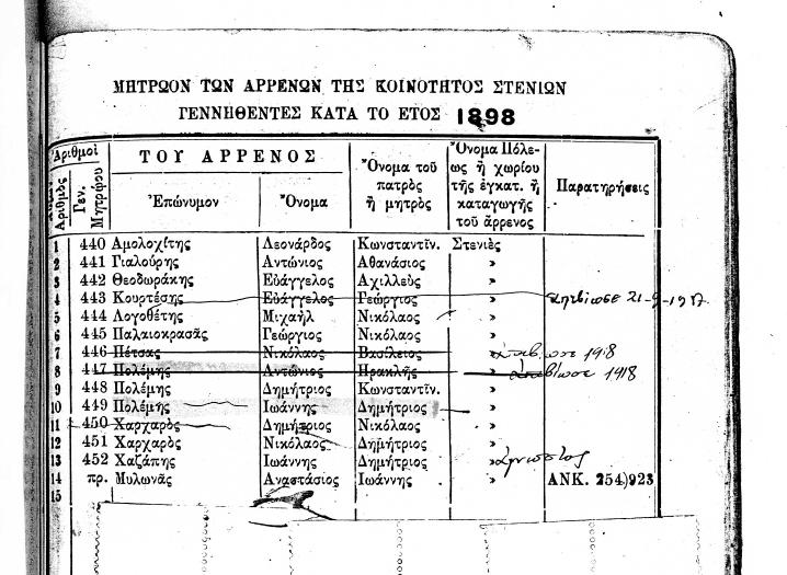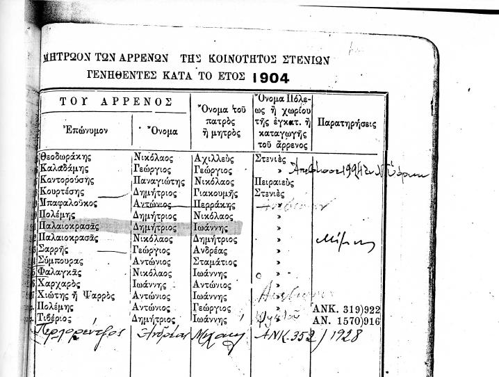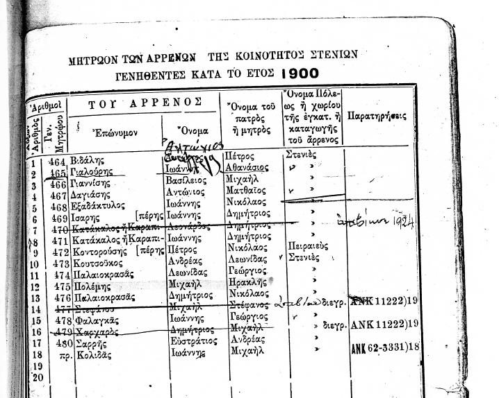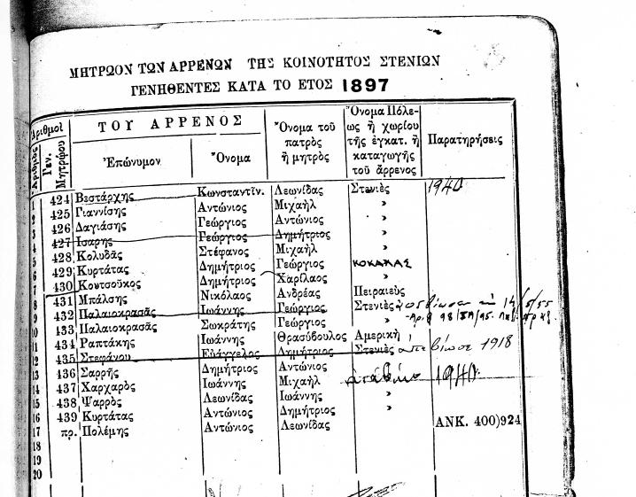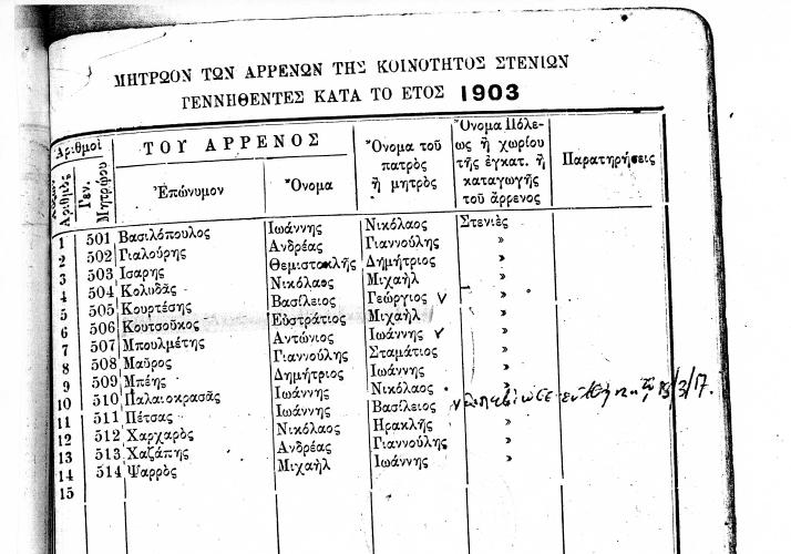 ΜΗΤΡΩΟΝ ΤΩΝ ΑΡΡΕΝΩΝ ΤΗΣ ΚΟΙΝΟΤΗΤΟΣ ΣΤΕΝΙΩΝ ΓΕΝΝΗΘΕΝΤΕΣ ΚΑΤΑ ΤΑ ΕΤΗ 1847 ΕΩΣ 1919