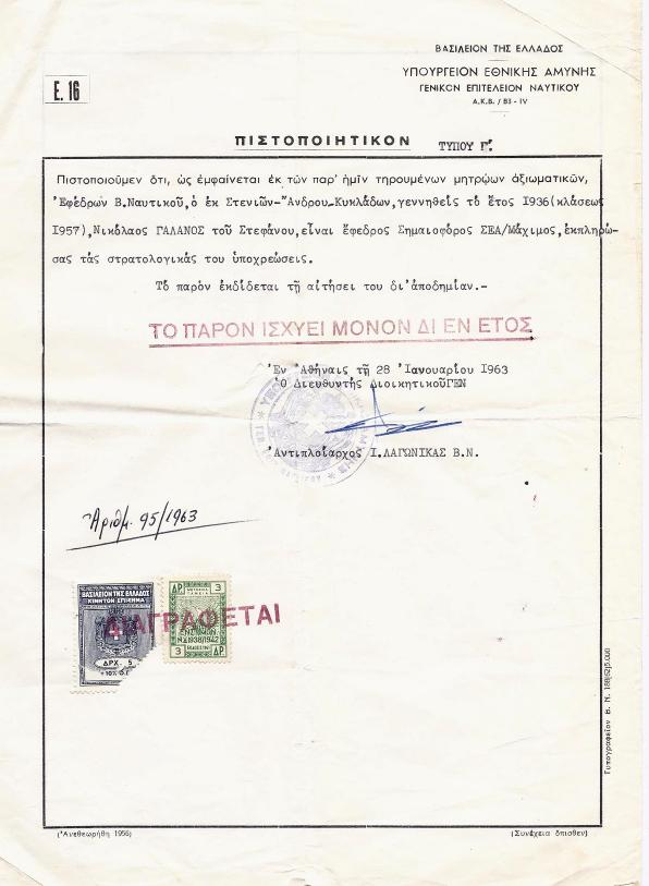 Το πιστοποιητικό προσέφερε ο γιος του κος Στέφανος Γαλανός