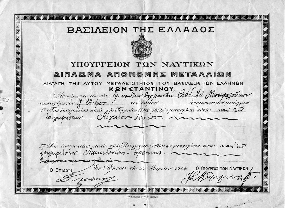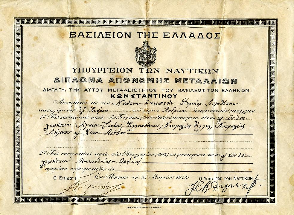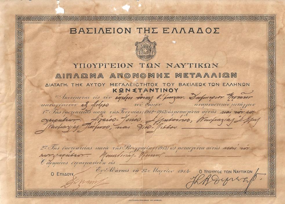 Διπλώματα απονομής μεταλλείων για συμμετοχή στους Βαλκανικούς πολέμους 1912-1913 στους