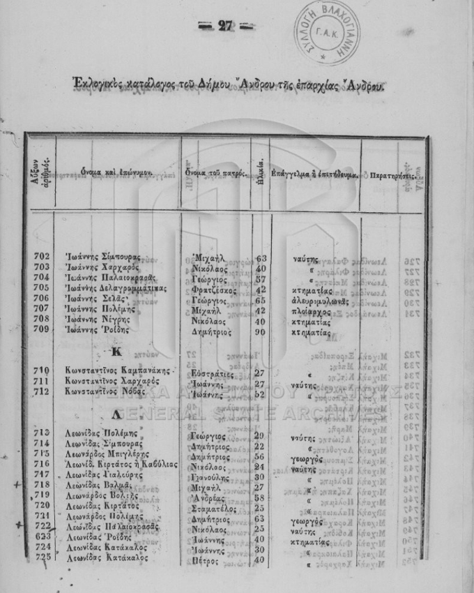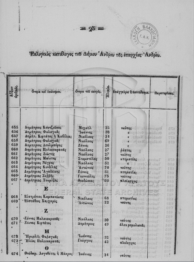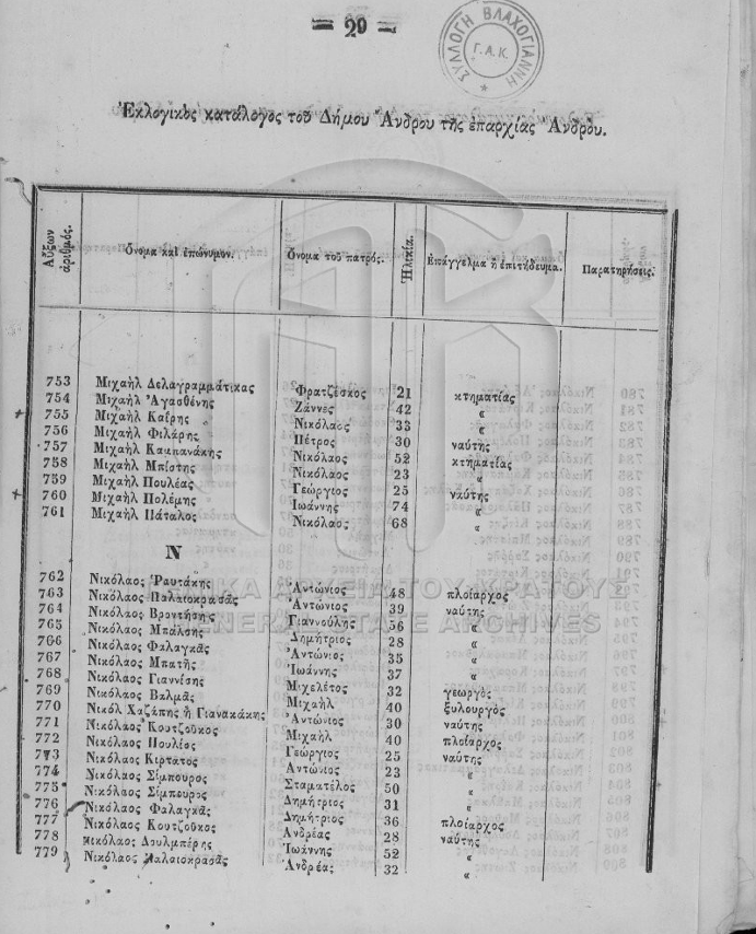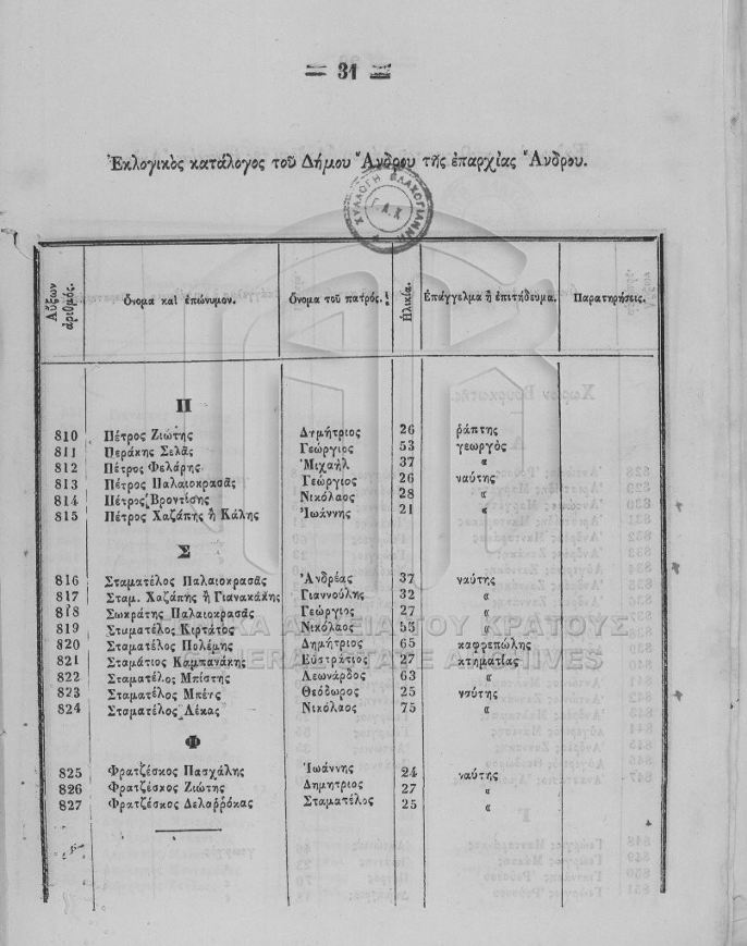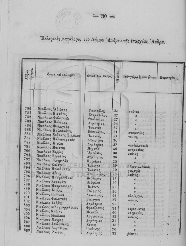 Εκλογικοί κατάλογοι Δήμου Ανδρου έτους 1865