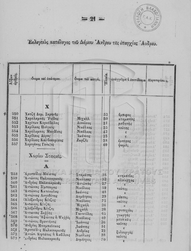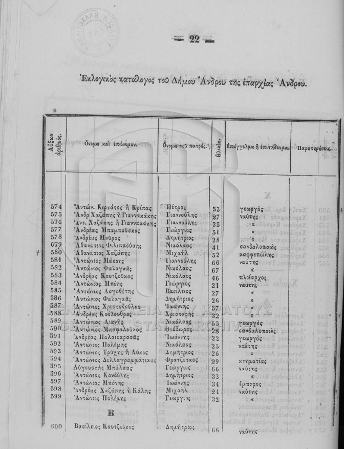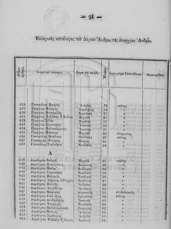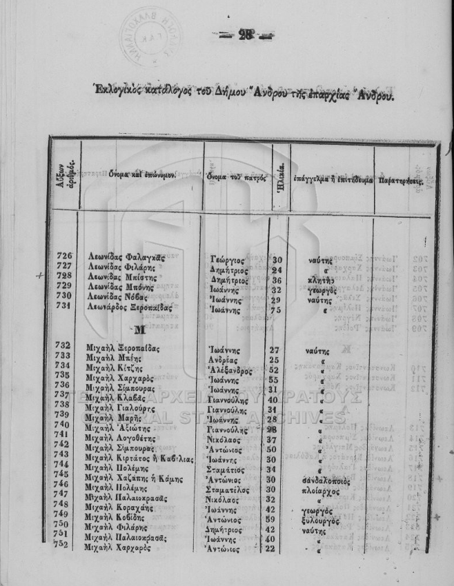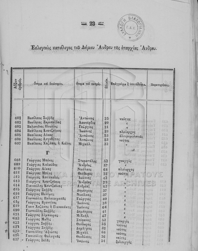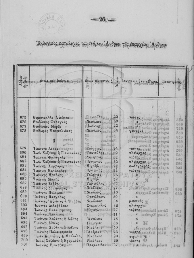 Εκλογικοί κατάλογοι Δήμου Ανδρου έτους 1865