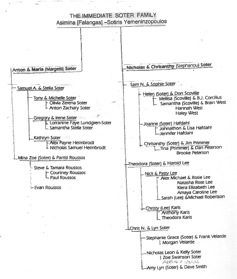 Στην πέμπτη σελίδα του κειμένου του Sam Soter, υπάρχει το οικογενειακό δέντρο του Σωτήρη Γεμενιτζόπουλου και της Ασημένιας Φαλαγκά και των δύο παιδιών τους Αντώνη και Νικόλαου, που εγκαταστάθηκαν στην Αμερική και άλλαξαν για ευκολία στη νέα τους πατρίδα, το επώνυμο τους σε Soter. Τα άλλα δύο παιδιά, Ερασμία και Σιλβέστρος δεν καταγράφονται. |