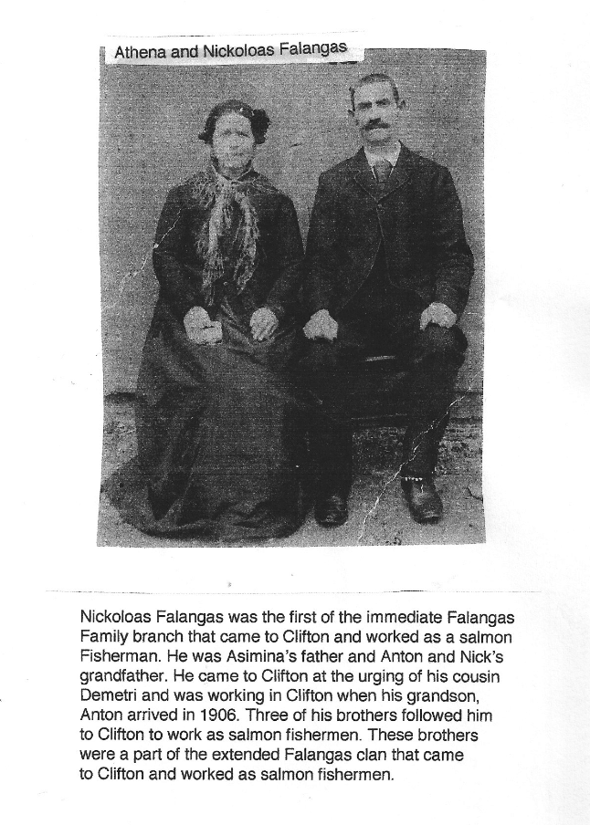 Ο Νικολός Φαλαγκάς ήταν ο πρώτος από τους κοντινούς συγγενείς Φαλαγκάδες που ήρθε στο Clifton και εργάστηκε σαν αλιέας σολομού. Ηταν ο πατέρας της Ασημένιας και παππούς των Anton και Nick Soter. Εφτασε στο Clifton με προτροπή του ξαδέλφου του Δημήτρη και εξακολουθούσε να εργάζεται στο Clifton όταν ο εγγονός του Anton έφτασε το 1906. Τρεις από τους αδελφούς του τον ακολούθησαν στο Clifton για να εργαστούν σαν αλιείς σολομού. Αυτοί οι αδελφοί ήταν μέρος της ευρύτερης οικογένειας Φαλαγκά που ήρθαν στο Clifton και εργάστηκαν σαν αλιείς σολομού. |