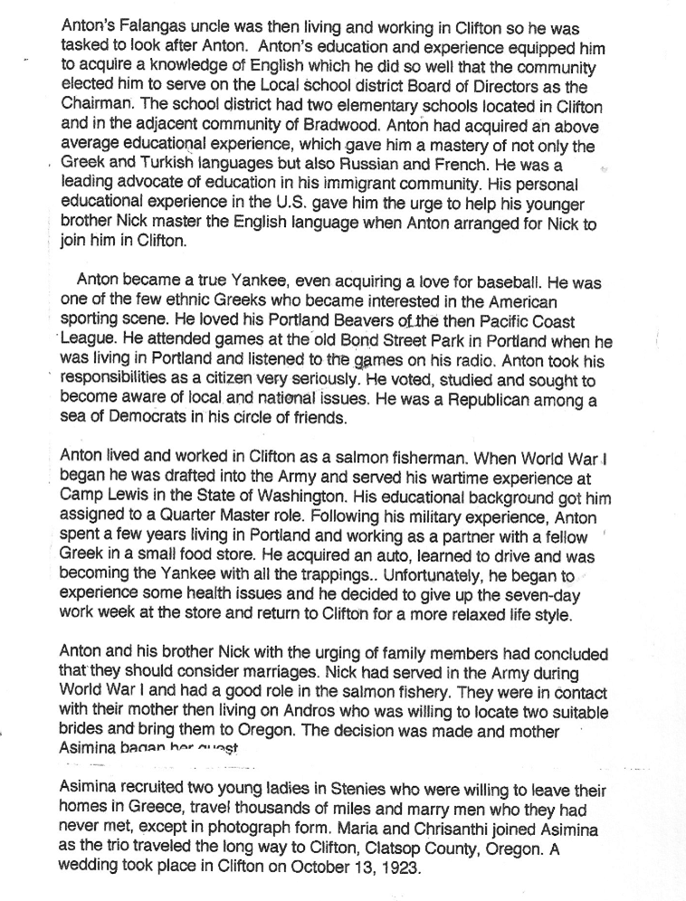 Ο θείος του Αντώνη, (σημ. ο Δημήτρης) Φαλαγκάς, εκείνη την εποχή ζούσε και εργάζονταν στο Clifton, έτσι ανέλαβε να έχει το νου του τον Αντώνη. Η εκπαίδευση και η εμπειρία του Αντώνη του επέτρεψαν να αποκτήσει τέτοια γνώση της Αγγλικής γλώσσας, που την έμαθε τόσο καλά, ώστε η εκεί κοινότητα τον επέλεξε στη σχολική επιτροπή σαν πρόεδρο. Η σχολική περιφέρια είχε δύο δημοτικά σχολεία στην περιοχή του Clifton και της κοντινής κοινότητας του Bradwood. Η εκπαιδευτική εμπειρία του Αντώνη ήταν πάνω του μέσου όρου, και αυτή του έδωσε τη δυνατότητα να κατέχει όχι μόνο την Ελληνική και την Τουρκική γλώσσα, αλλά επίσης της Ρωσικής και της Γαλλικής. Ήταν υποστηρικτής του θέματος της εκπαίδευσης στην κοινότητα των μεταναστών της οποίας ήταν μέλος. Οι εκπαιδευτικές εμπειρίες στις ΗΠΑ, τον ώθησαν να βοηθήσει τον νεώτερο αδελφό του Νικόλαο να εκμάθει την Αγγλική γλώσσα όταν ο Αντώνης κανόνισε να έρθει ο Νικόλαος να τον συναντήσει στο Clifton. Ο Αντώνης έγινε ένας αληθινός Γιάνκης, αποκτώντας ακόμα και πάθος με το μπέιζμπολ. Ηταν ένα από τα πολύ λίγα Ελληνικής καταγωγής άτομα που έδειξαν ενδιαφέρον για την Αμερικανική αθλητική σκηνή. Αγαπούσε τους Portland Beavers της τότε λίγκας της Ακτής του Ειρηνικού. Παρακολουθούσε παιχνίδια στο Old Bond Street Park στο Portland, όταν ζούσε στο Portland και άκουγε τους αγώνες στο ραδιόφωνο. Ο Αντώνης αναλάμβανε τις ευθύνες του σαν πολίτης πολύ σοβαρά. Ψήφιζε, μελετούσε και ζητούσε να είναι ενήμερος για τα τοπικά και εθνικά θέματα. Ηταν Ρεπουμπλικάνος, μόνος ανάμεσα σε μια θάλασσα από Δημοκρατικούς μέσα στον κύκλο των φίλων του. Ο Αντώνης ζούσε και εργάζονταν στο Clifton σαν αλιέας σολομού. Όταν ξέσπασε ο πρώτος Παγκόσμιος Πόλεμος κατaτάχτηκε στο Στρατό και υπηρέτησε τη θητεία του στο Στρατόπεδο Lewis της πολιτείας Washington. Οι γραμματικές του γνώσεις του επέτρεψαν να πάρει καθήκοντα Οπλίτη Εφοδιασμού. Μετά το στρατό, ο Αντώνης πέρασε μερικά χρόνια στο Portland εργαζόμενος συνεταιρικά με κάποιον άλλο Ελληνα σε ένα μικρό παντοπωλείο. Απέκτησε αυτοκίνητο, έμαθε να οδηγεί και έγινε ένα Γιάνκης με όλα τα καλούδια. Δυστυχώς, άρχισε να αντιμετωπίζει κάποια προβλήματα υγείας και αποφάσισε να εγκαταλείψει την καθημερινή ακόμα και τις Κυριακές εργασία στο μαγαζί και να επιστρέψει στο Clifton για μια πιο ήρεμη ζωή. Ο Αντώνης και ο αδελφός του Νικόλαος, με την προτροπή των μελών της οικογένειας, αποφάσισαν ότι έπρεπε να παντρευτούν. Ο Νικόλαος υπηρέτησε στο στρατό κατά τον Πρώτο Παγκόσμιο Πόλεμο και (σημ. κατόπιν) είχε καλό πόστο στην αλιεία του σολομού. Με τη μητέρα τους Ασημένια που τότε ζούσε στην Ανδρο, ήταν συνέχεια σε επαφή και η οποία επιθυμούσε να βρει δυο κατάλληλες νύφες και να τις φέρει στο Oregon. Η απόφαση πάρθηκε και η Ασημένια άρχισε την αναζήτηση. Η Ασημένια βρήκε στις Στενιές δυο νεαρές κοπέλες οι οποίες επιθυμούσαν να αφήσουν τα σπίτια τους στην Ελλάδα, να ταξιδέψουν χιλιάδες μίλια μακριά και να παντρευτούν με άνδρες που ουδέποτε είχαν συναντήσει παρά μόνο δει σε φωτογραφίες. Η Μαρία και η Χρυσάνθη έκαναν με την Ασημένια το μεγάλο ταξίδι στο Clifton της κομητείας Clatsop στην πολιτεία Oregon. Ο γάμος και των δύο ζευγαριών έγινε στο Clifton, στις 13 Οκτωβρίου 1923. |