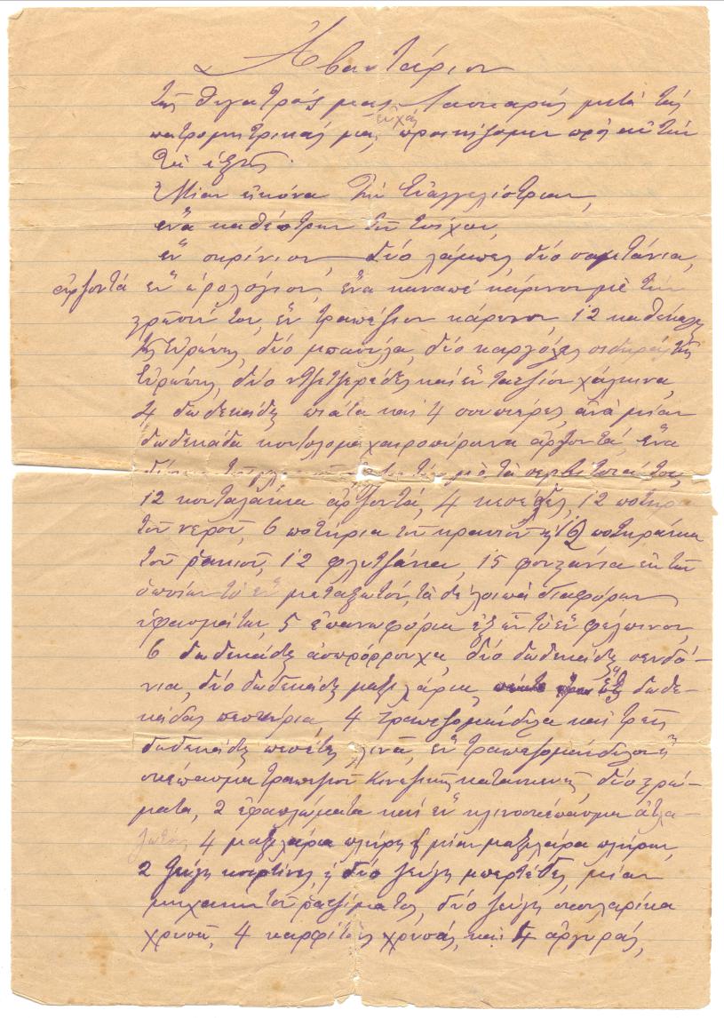 Της θυγατρός μας Λασκαρώς μετά τας πατρομητρικάς μας ευχάς, προικίζομεν προς αυτήν τα εξής: Μίαν εικόναν της Ευαγγελιστρίας, έναν καθρέπτην του τοίχου, εν σκρίνιον, δύο λάμπες, δύο (δυσανάγνωστη λέξη) αρζαντά (1), εν ωρολόγιον, ένα καναπέ κάρυνον (2) με την στρώσιν του, εν τραπέζιον κάρυνον, 12 καθέκλας της Ευρώπης, δύο μπαούλα, δύο καργιόλας σιδηράς της Ευρώπης, δύο ντεντζερέδες και εν ταψίον χάλκινα, 4 δεδεκάδας πιάτα και 4 σουπιέρες, ανά μιάν δωδεκάδα κουταλομαχαιροπήρουνα αρζαντά, ένα (δίσκο του γλυκού αρζαντά) με τα σερβίτσια του, 12 κουταλάκια αρζαντά, 4 κεσέδες, 12 ποτήρια του νερού, 6 ποτήρια του κρασιού, 12 ποτηράκια του ρακιού, 12 φλυτζάνια, 15 φουστάνια εκ των οποίων το έν μεταξωτόν, τα δε λοιπά διαφόρων υφασμάτων, 5 επανωφόρια εξ ων το εν φέλπινον, 6 δωδεκάδες ασπρόρουχα, δύο δωδεκάδες σεντόνια, δύο δωδεκάδες μαξιλάρια (3), εξ δωδεκάδες πεσκύρια, 4 τραπεζομάνδηλα και τρεις δωδεκάδες πετσέτες λινά, εν τραπεζομάντηλον ή σκέπασμα τραπεζιού κινεζικής κατασκευής, 2 στρώματα, 2 εφαπλώματα και εν κλινοσκέπασμα ατλαζωτόν, 4 μαξιλάρια πλήρη και μίαν μαξιλάραν πλήρην, 2 ζεύγη κουρτίνες και δύο ζεύγη μπερντέδες, μίαν μηχανήν του ραψίματος, δύο ζεύγη σκουλαρίκια χρυσά, 4 καρφίτσας χρυσάς και 4 αργυράς, τρία δακτυλίδια χρυσά , εν βραχιόλιον αργυρούν.Την εν Στενιαίς οικίαν μας, συνισταμένην εκ μίας αιθούσης, ενός δωματίου και μαγειρίου και το όπισθεν οικόπεδον, μετά του συνεχομένου δωματίου και του παλαιού μαγειρίου, υπό τον όρον να κρατούμεν ως γεροντομοίριον επί δέκα έτη από της στεφανώσεως το συνεχόμενον τούτο δωμάτιον και το παλαιόν μαγειρείον και μετά παρέλευσιν της δεκαετίας να μένουν πάντα ελεύθερα προς την θυγατέραν μας τούτην Λασκαρώ ολόκληρος αύτη (η) οικία μεθ΄όλης της περιοχής και παραρτημάτων της, προσέτι της προικίζομεν και το εις την θέση Πέρα Μπάντα Στενιών κτήμα περιβόλιον με (δυσανάγνωστες λέξεις) ως ανέκαθεν εποτίζετο κατά Κυριακήν, συνορευόμενον με κτήμα του Χρήστου Ζαννή, του Μιλτιάδη Δερτούζου και Σταμ. Πολέμη.