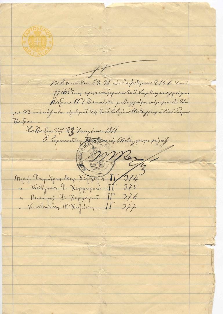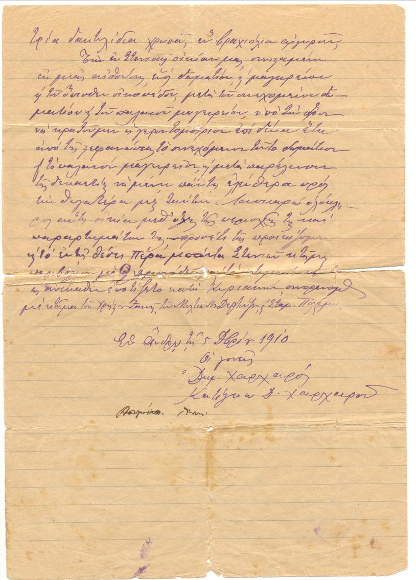 Εν Ανδρω τη 5 Δεκεμβρίου 1910 Οι γονείς Δημ.Χαρχαρός Κατίγκω Δ.Χαρχαρού