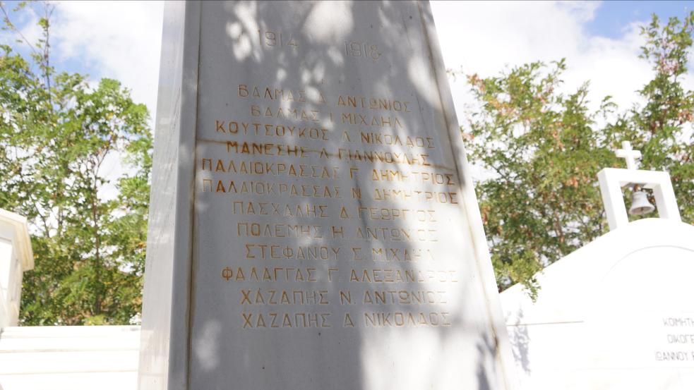 Στην ανατολική πλάκα του μνημείου αναγράφονται τα ονόματα των πεσόντων κατά τη διάρκεια του Πρώτου Παγκοσμίου Πολέμου, 1914-1918.
