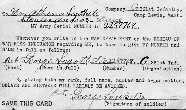 Με το δελτάριο αυτό ο Γ.Λογοθέτης ζητά από την μητέρα του Αθηνά, να γράφει τον αριθμό μητρώου του μαζί με τα λοιπά στοιχεία του όποτε επικοινωνεί με τις στρατιωτικές αρχές για να μάθει (από αυτές) νέα του (ή στην χειρότερη περίπτωση για την τύχη του).