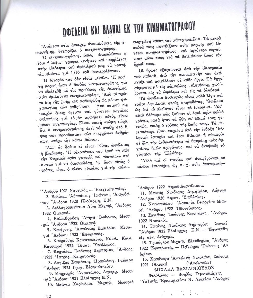 Από το περιοδικό Πορεία που εξέδιδε το Γυμνάσιο Ανδρου φροντίδι του αειμνήστου Μιχαήλ Βασιλοπούλου, φιλολόγου, τότε βοηθού Γυμνασιάρχου, Υποδιευθυντού του Εμπειρικείου Ναυτικού Λυκείου Ανδρου.