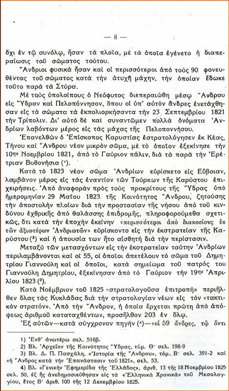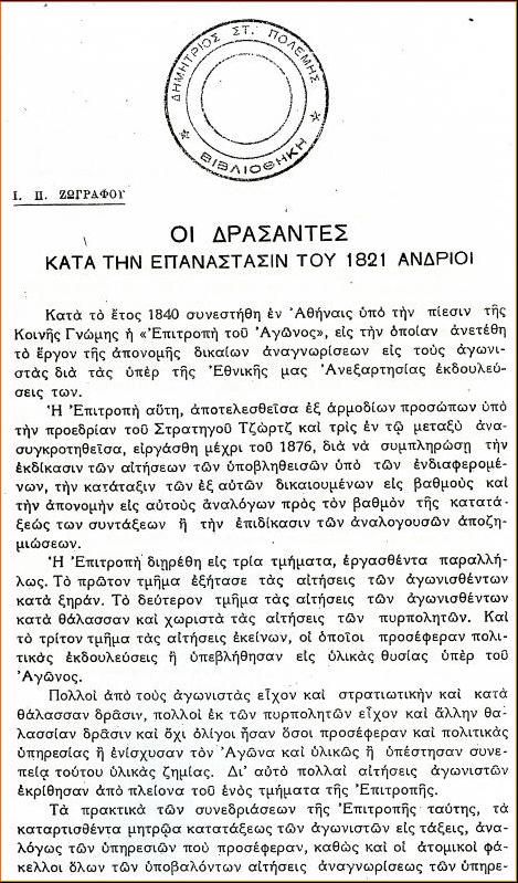 Ο κος Τάκης Στ. Πολέμης (1112611) #33 info είχε την καλοσύνη να μου προσφέρει το βιβλίο του Ι.Π.Ζωγράφου με τον τίτλο «Οι δράσαντες κατά την Επανάστασην του 1821 Ανδρίοι». Από το βιβλίο αυτό παραθέτω την αρχή του καθώς και τα τμήματα εκείνα, που αφορούν Στενιώτες.
