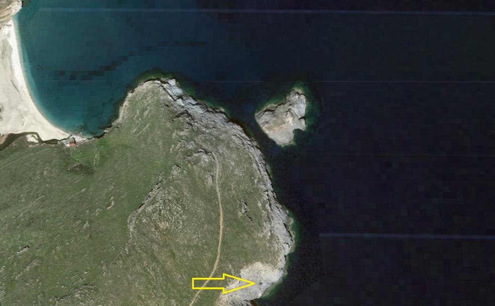 Πάνω, δορυφορική φωτογραφία του αλμύριχου που σημειώνεται με κίτρινο βέλος. Πάνω αριστερά η Στάχλα (η παραλία του ποταμού Αχλα).