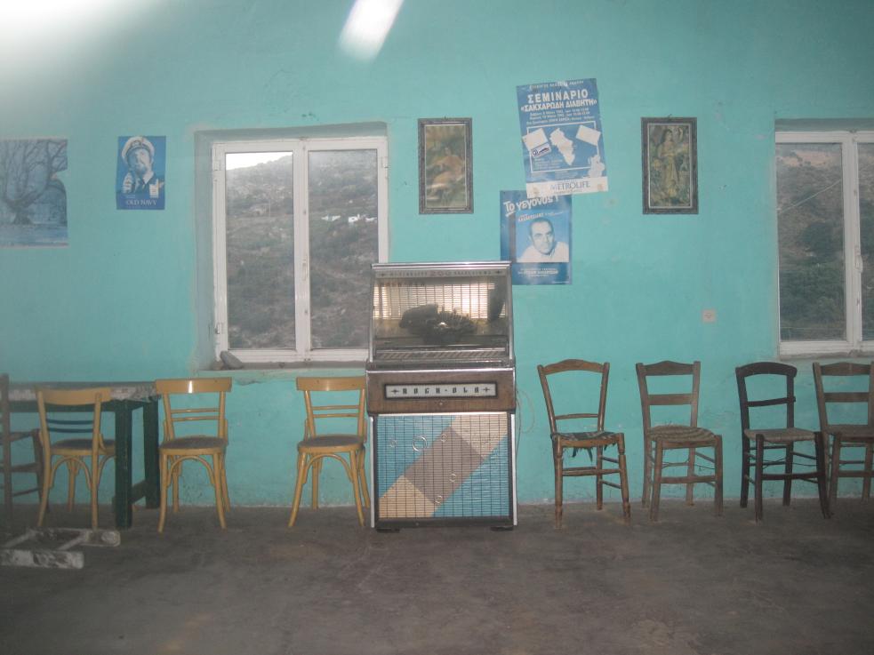 Κάτω, το εσωτερικό του καφενείου που δεν ήταν σε χρήση πια, σε φωτογραφία το 2014, που τραβήχτηκε από το δρόμο έξω από το κλειστό παράθυρο.