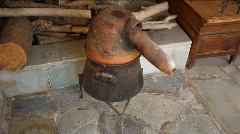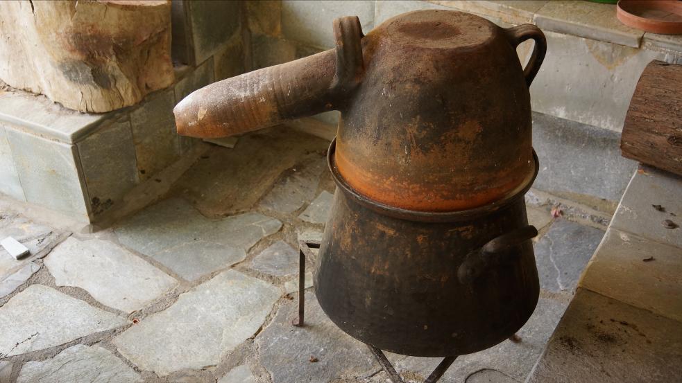 Κάτω, το καπάκι στο οποίο συγκεντρώνονται οι ατμοί της απόσταξης και ψύχονται. Το καπάκι αυτό έχει δύο λαβές για τη μεταφορά του. Όπως φαίνεται στη φωτογραφία, το καπάκι κάθεται τέλεια πάνω στην πατούρα του καζανιού. Η στεγανοποίηση της συσκευής με λάσπη από κοκκινόχωμα εκεί που εφάπτονται το μπακιρένιο καζάνι και το πήλινο καπάκι είναι πια εύκολη υπόθεση.
