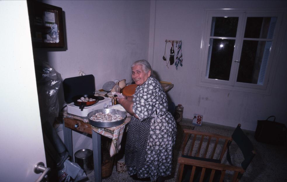 Κάτω, η γιαγιά μου η Βιολάντη σε ένα παρακούζινο τηγανίζει χοιρινούς κεφτέδες.