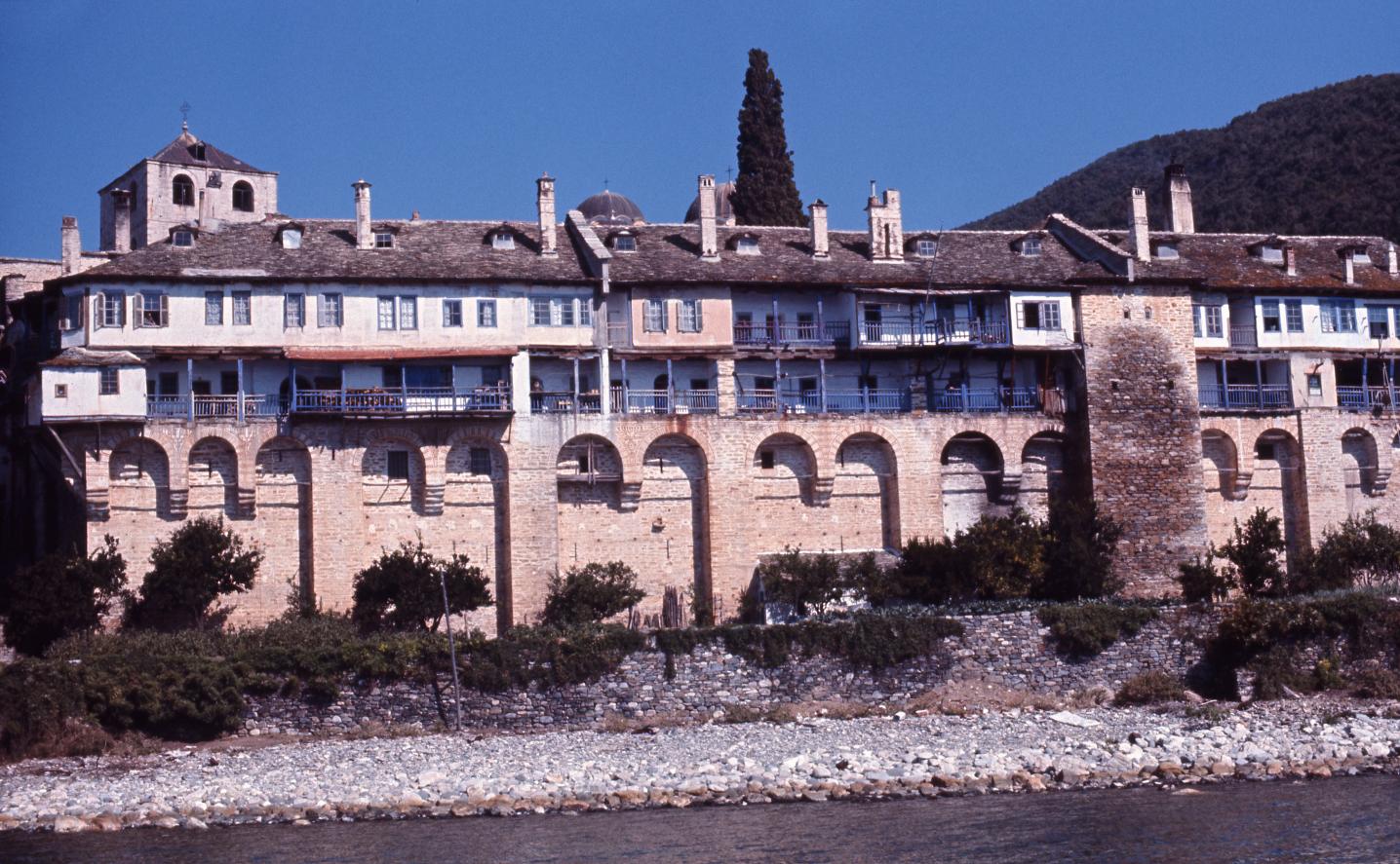 Xenophontos monastery stands near the seashore on a rather flat surface, making it more spacious than the Dohiariou monastery which is built on a slope. The walls of the monastery are tall and strong to keep the enemy outside.
