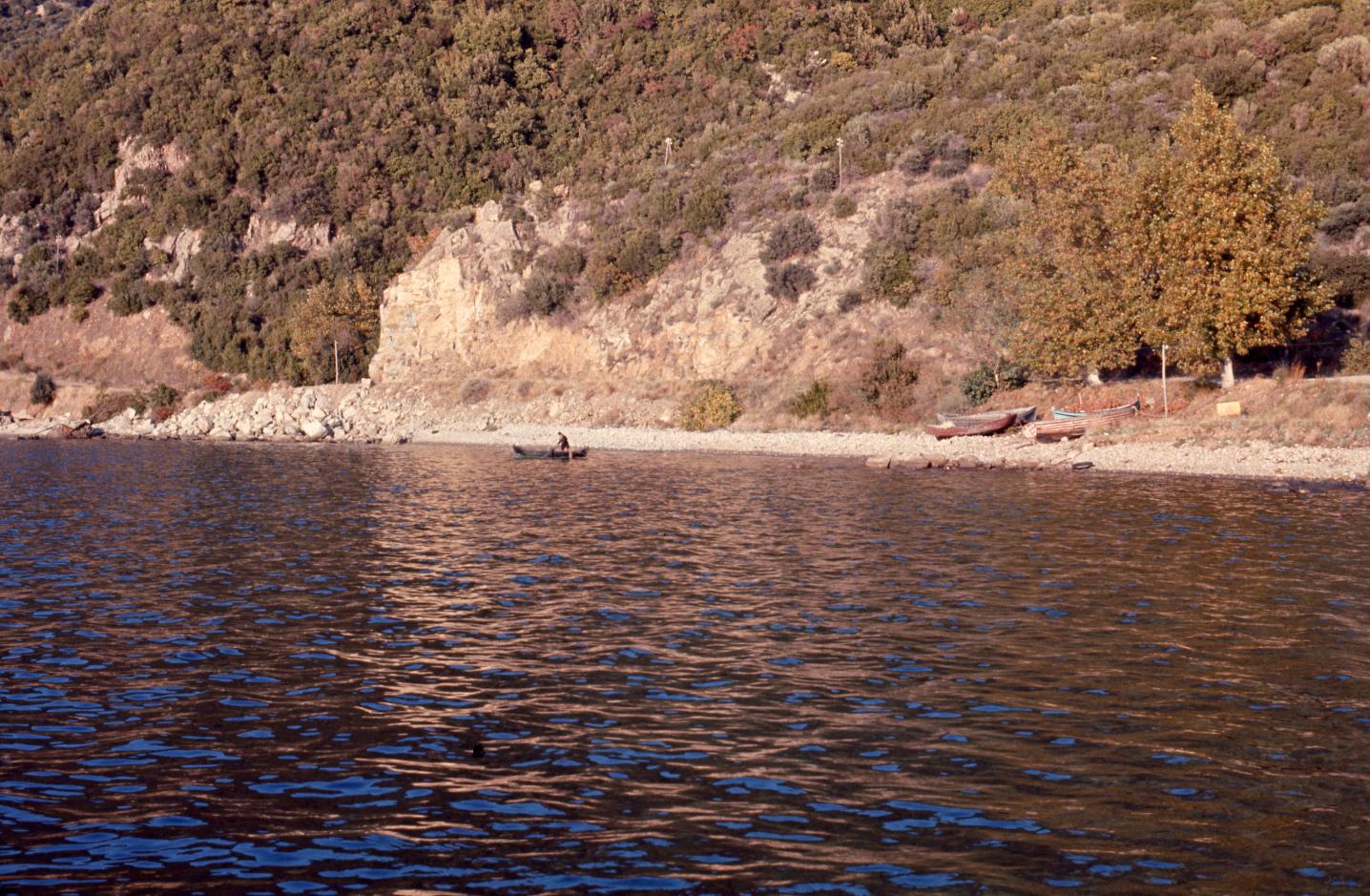 Σε μια τοποθεσία λίγο μετά τη Δάφνη, κοντά στην ακροθαλασσιά, ένας μοναχός σε μια μικρή βάρκα προσπαθεί να πιάσει ψάρια με δίχτυα. Φαίνεται ο χωματόδρομος προς τις Καρυές.