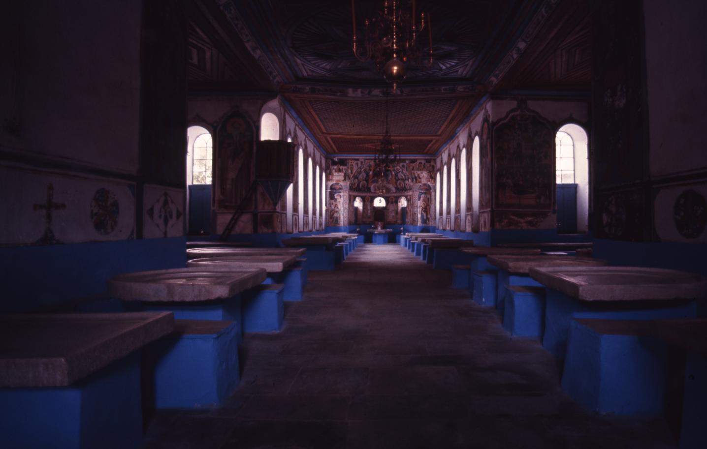 The inside of the Trapeza. The tables are made of marble. The seats are on purpose as uncomfortable as possible.