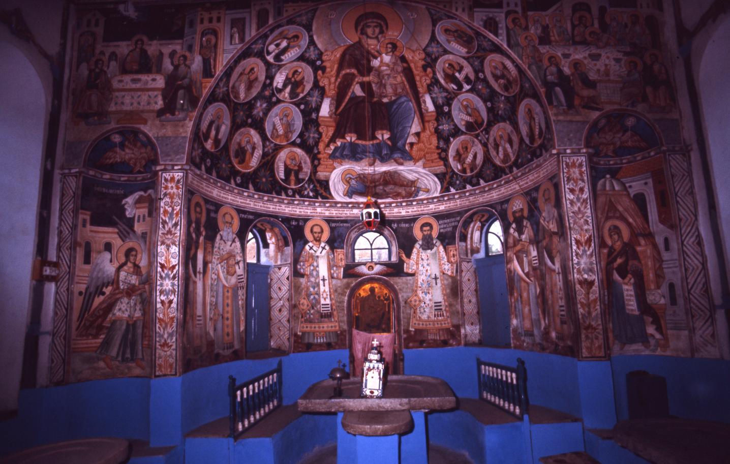 The κόγχη (niche) of the refectory. The place is reserved for the head of the monastery (hegoumen / ηγούμενος) if any and high rank guests and officials. _ _ _ _ _ _ _ In 1971 some monasteries had a hegoumen (abbot / head of the monastery) and some (for centuries) had not. The decision to have a hegoumen who is chosen for life, cannot be reversed. In present time (after 1992) all monasteries have a hegoumen. In the case of Sketes some do not have a hegoumen.