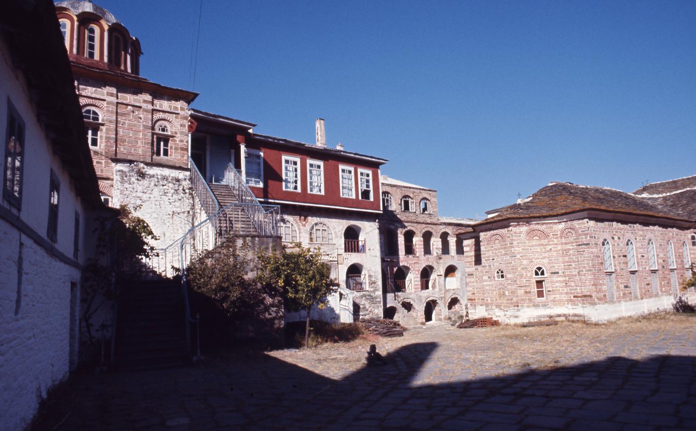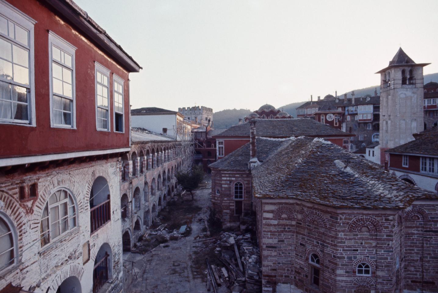 The view from the Archontariki. To the left, the Trapeza (the refectory) and in the middle the bell tower. The use of the building to the right was a gallery for the holy icons of the monastery.