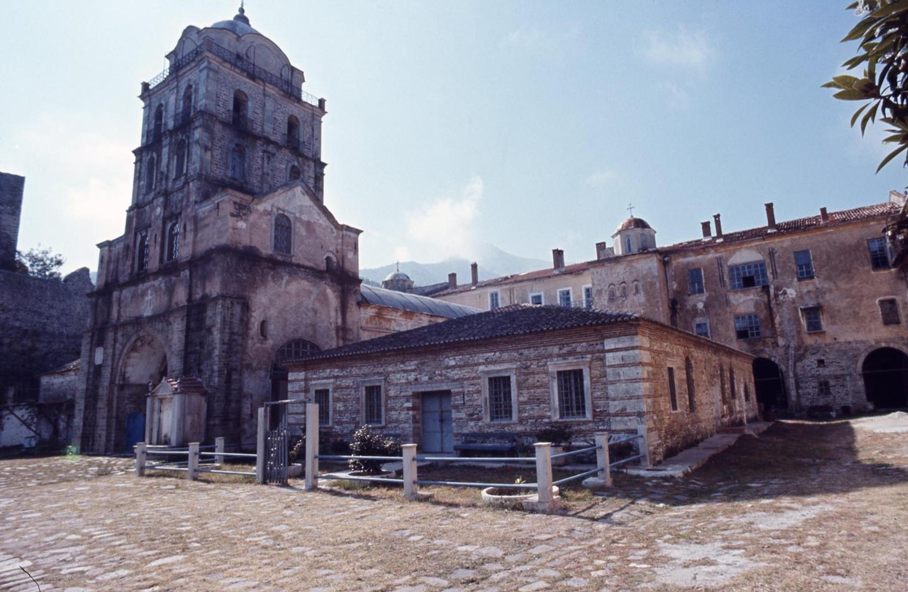 Το χαμηλό κτήριο στα δεξιά είναι η Βιβλιοθήκη του μοναστηριού.