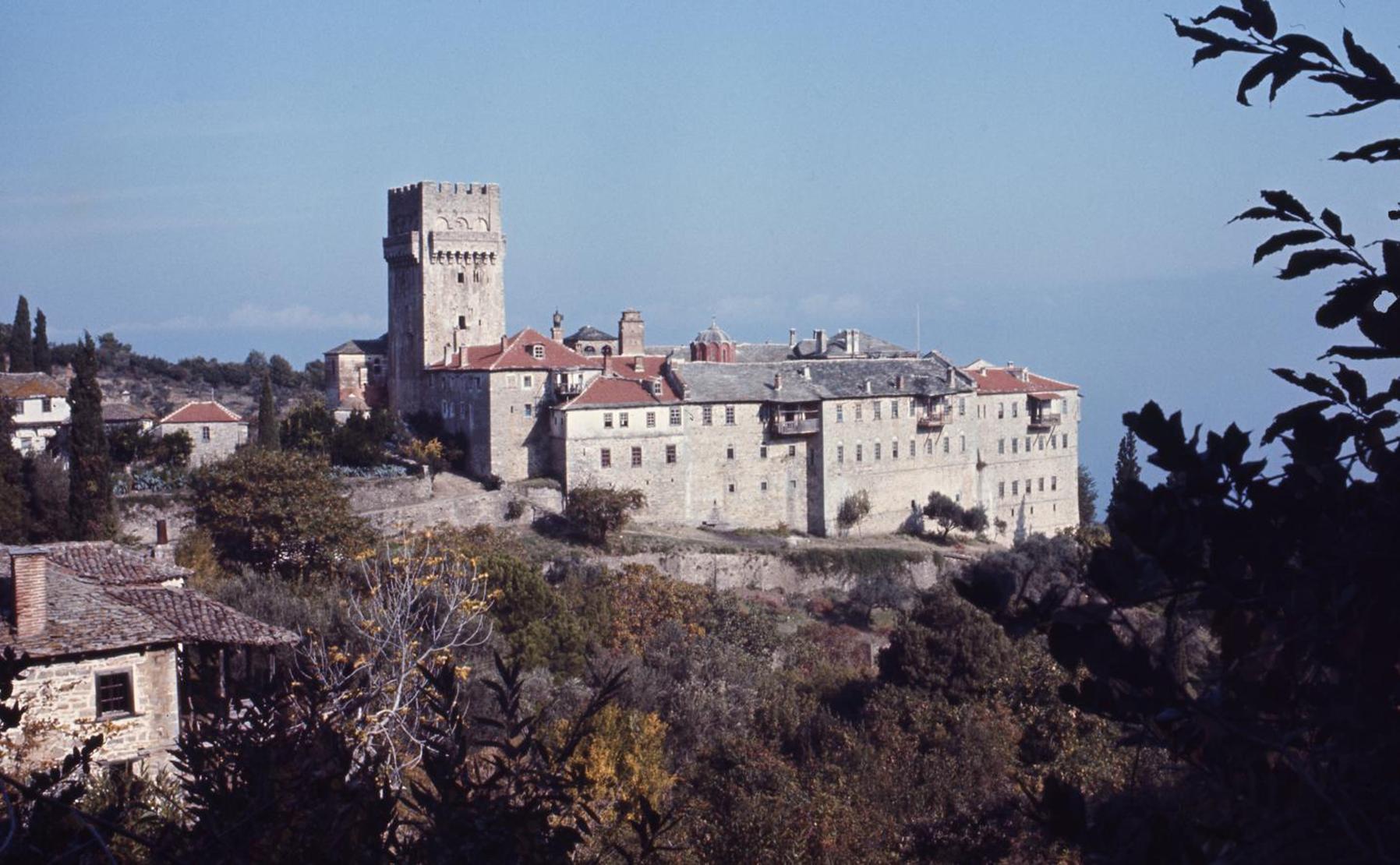 First view of the monastery from the trail from Philotheou to Karakallou.