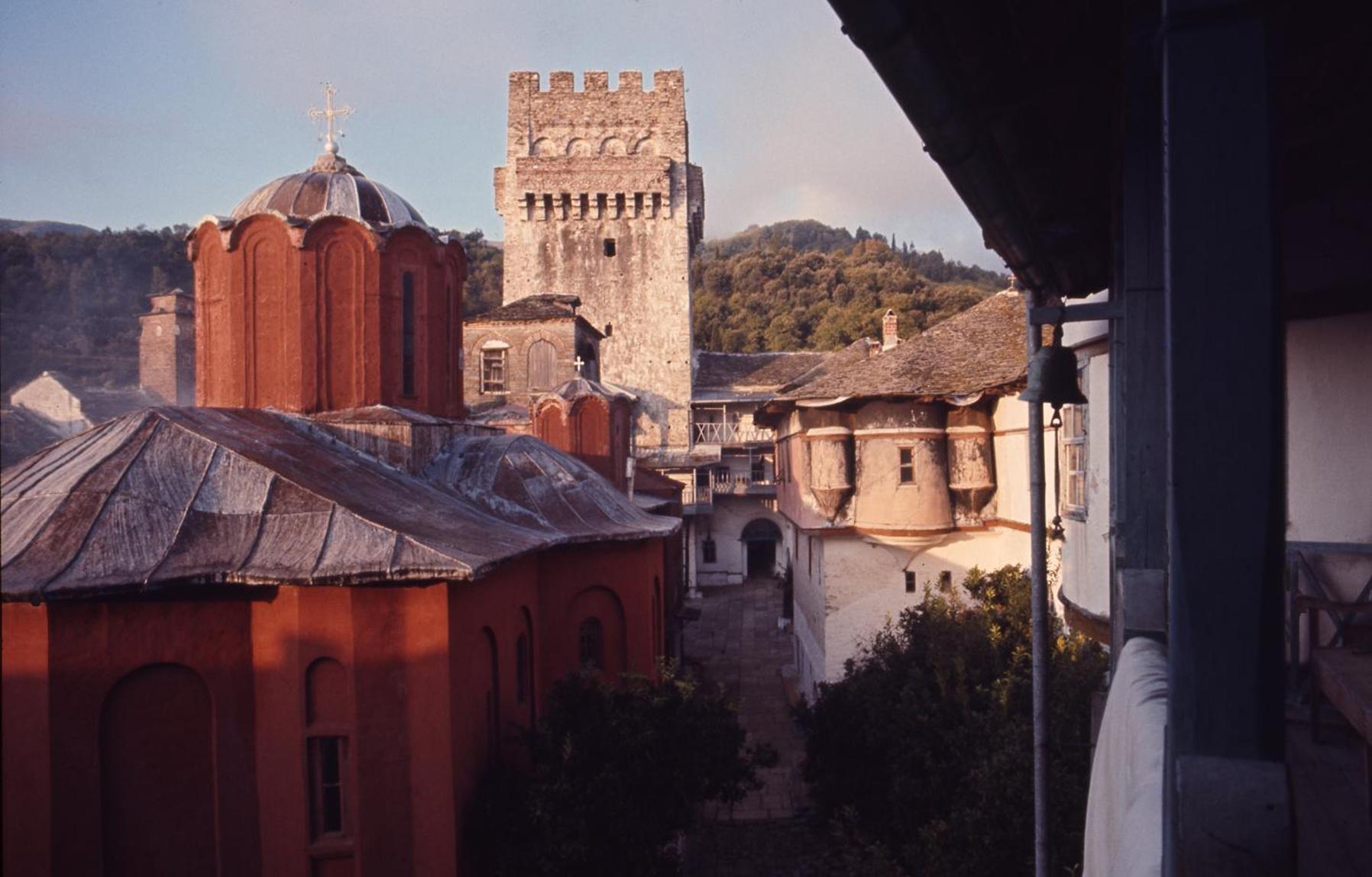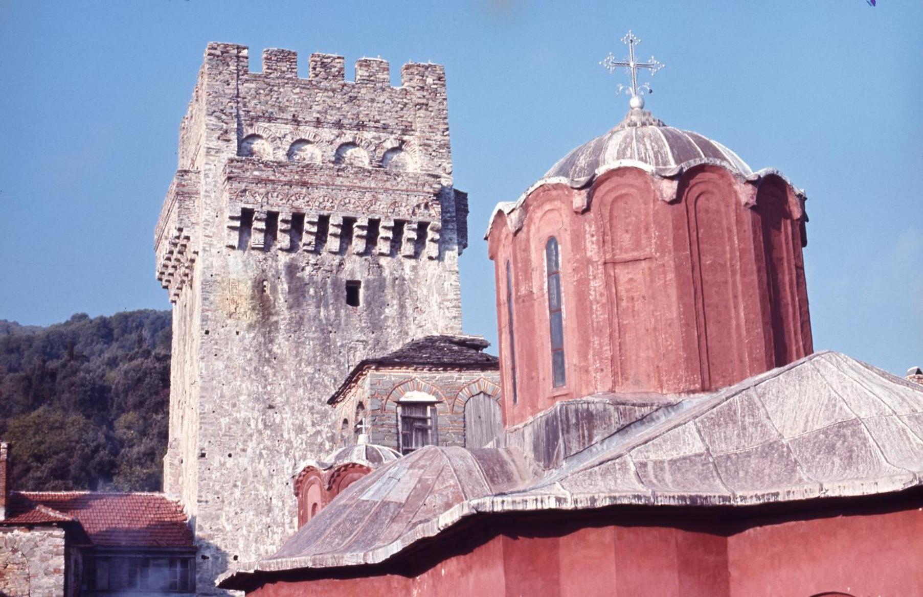 View of Katholikon and the tower of the Monastery